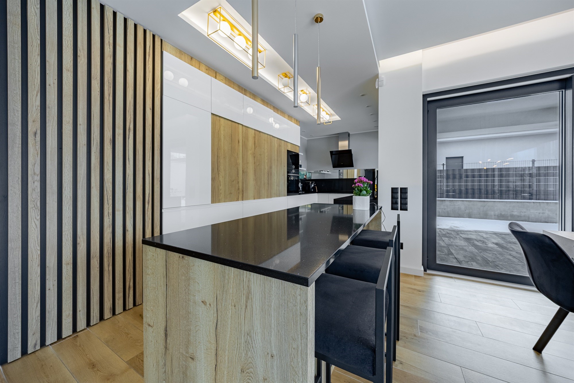 - Kuchnia – majstersztyk ergonomii: Jeśli cenisz jakość, docenisz kamienne blaty i pełne wyposażenie klasy premium. Kuchnia posiada stylowy stół do szybkich śniadań oraz – co jest prawdziwym hitem – dużą spiżarnię ukrytą w zabudowie meblowej. To czysta estetyka bez kompromisów.