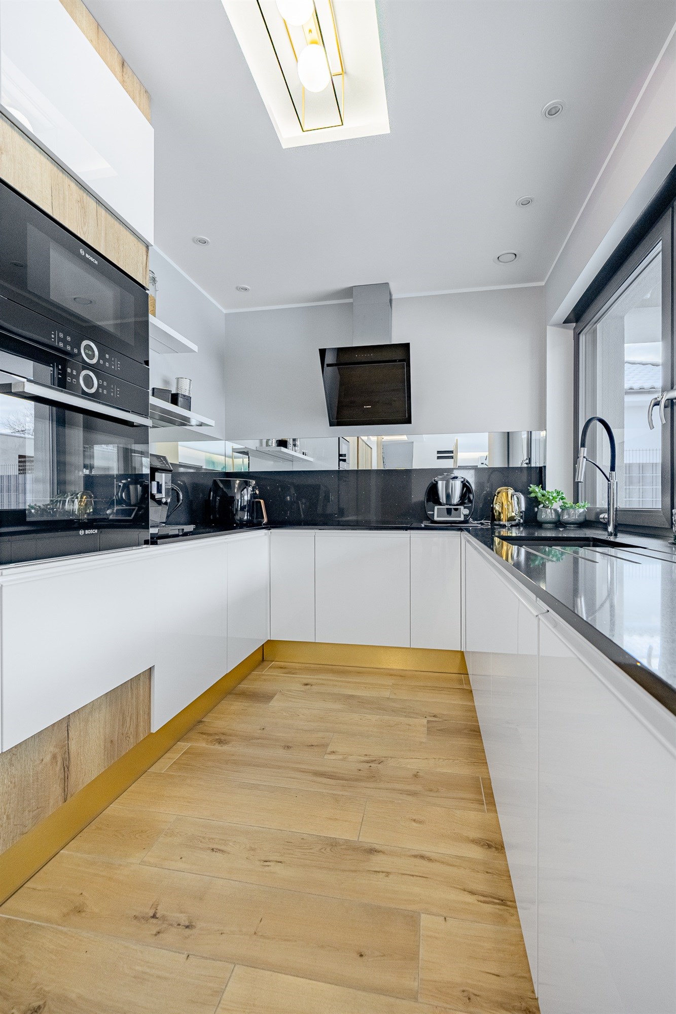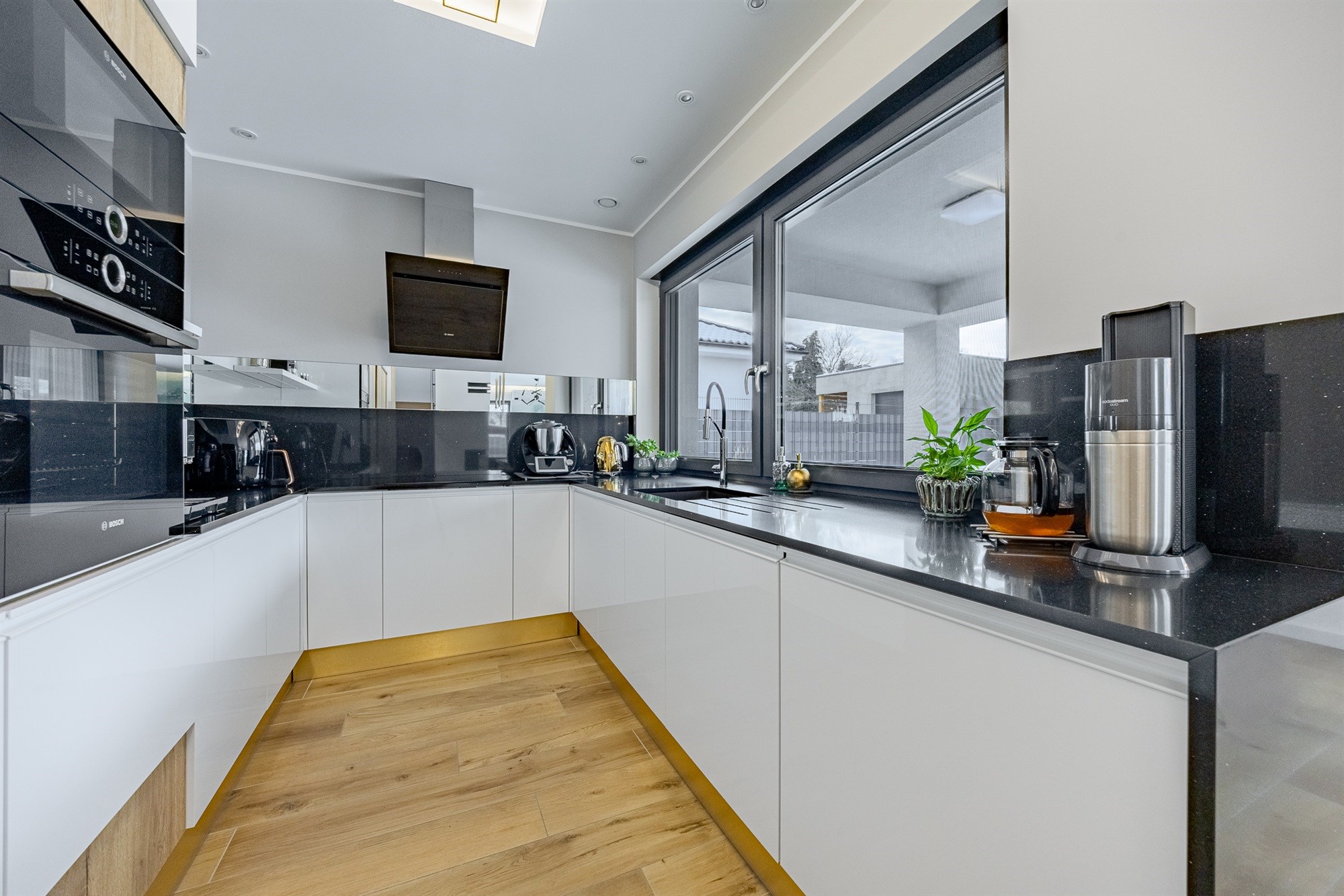 - Ogrzewanie: Piec gazowy Buderus GB122i z zasobnikiem 120l. Ogrzewanie podłogowe obejmuje cały dom, w tym garaż i pralnię, a każde pomieszczenie posiada własny, niezależny sterownik temperatury.