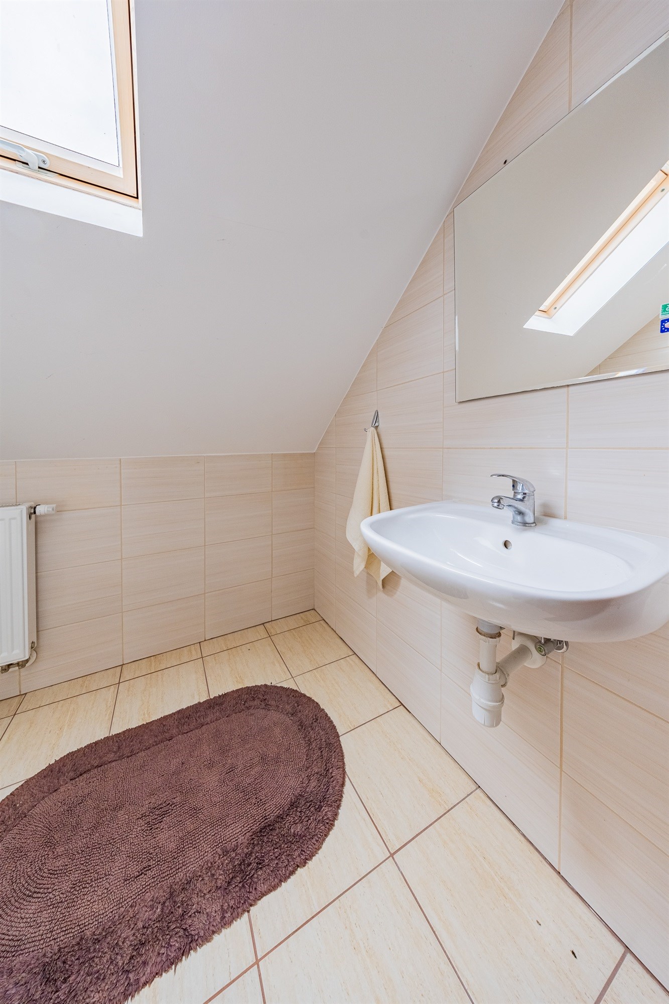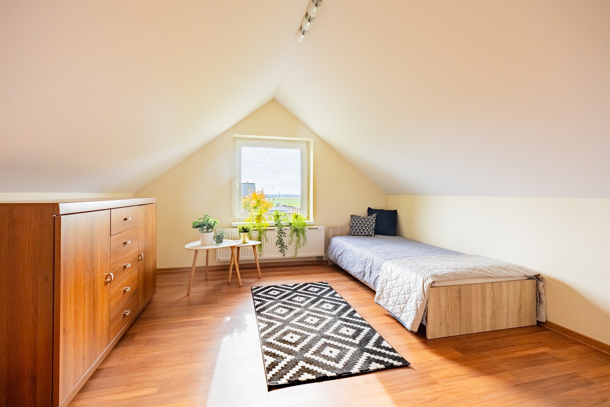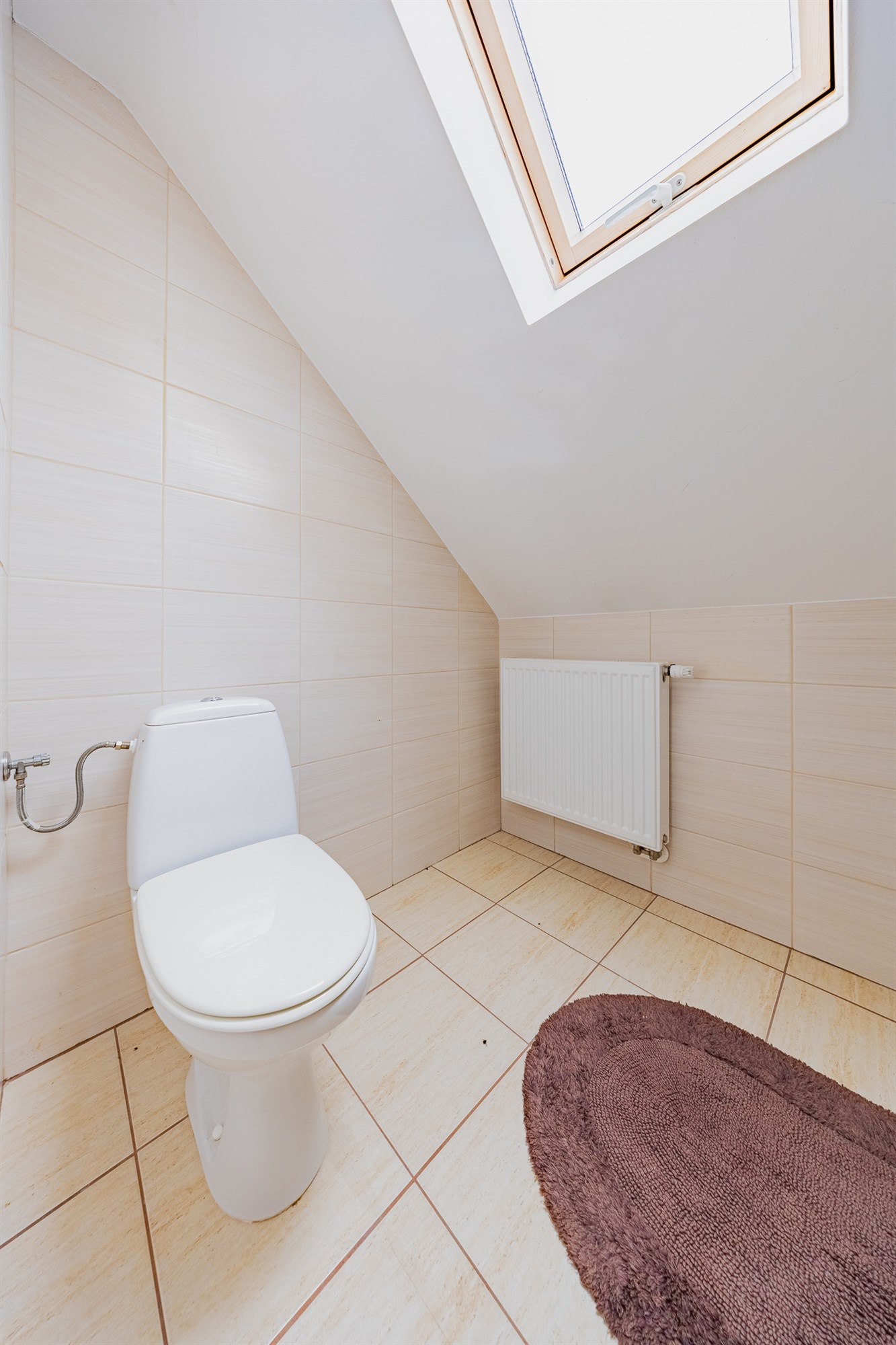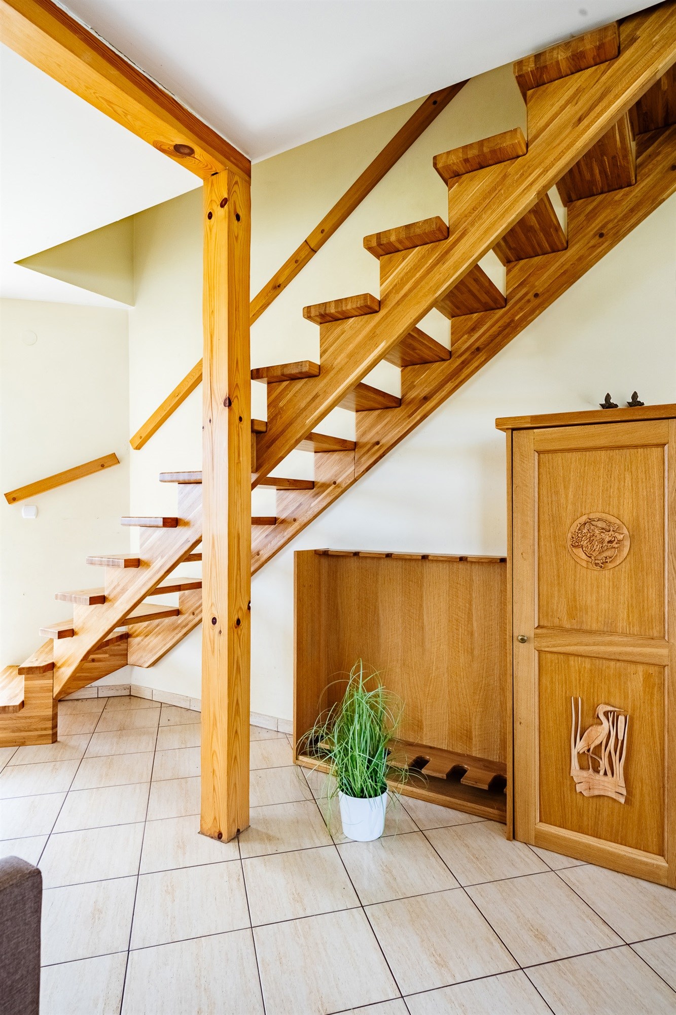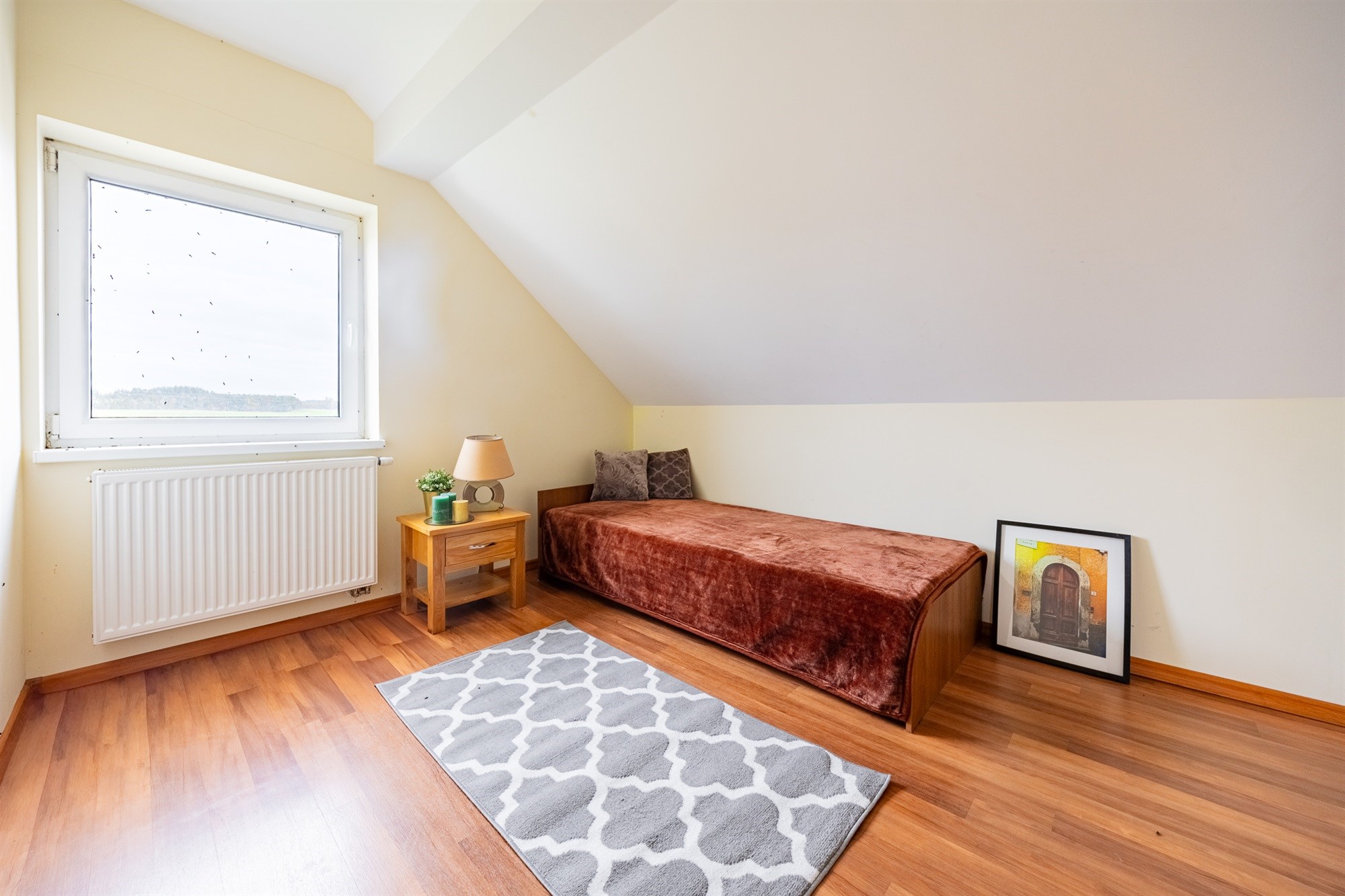 Na piętro prowadzą drewniane schody. Znajdują się tu trzy sypialnie, które zapewnią komfortowy wypoczynek dla całej rodziny oraz łazienka z WC.
