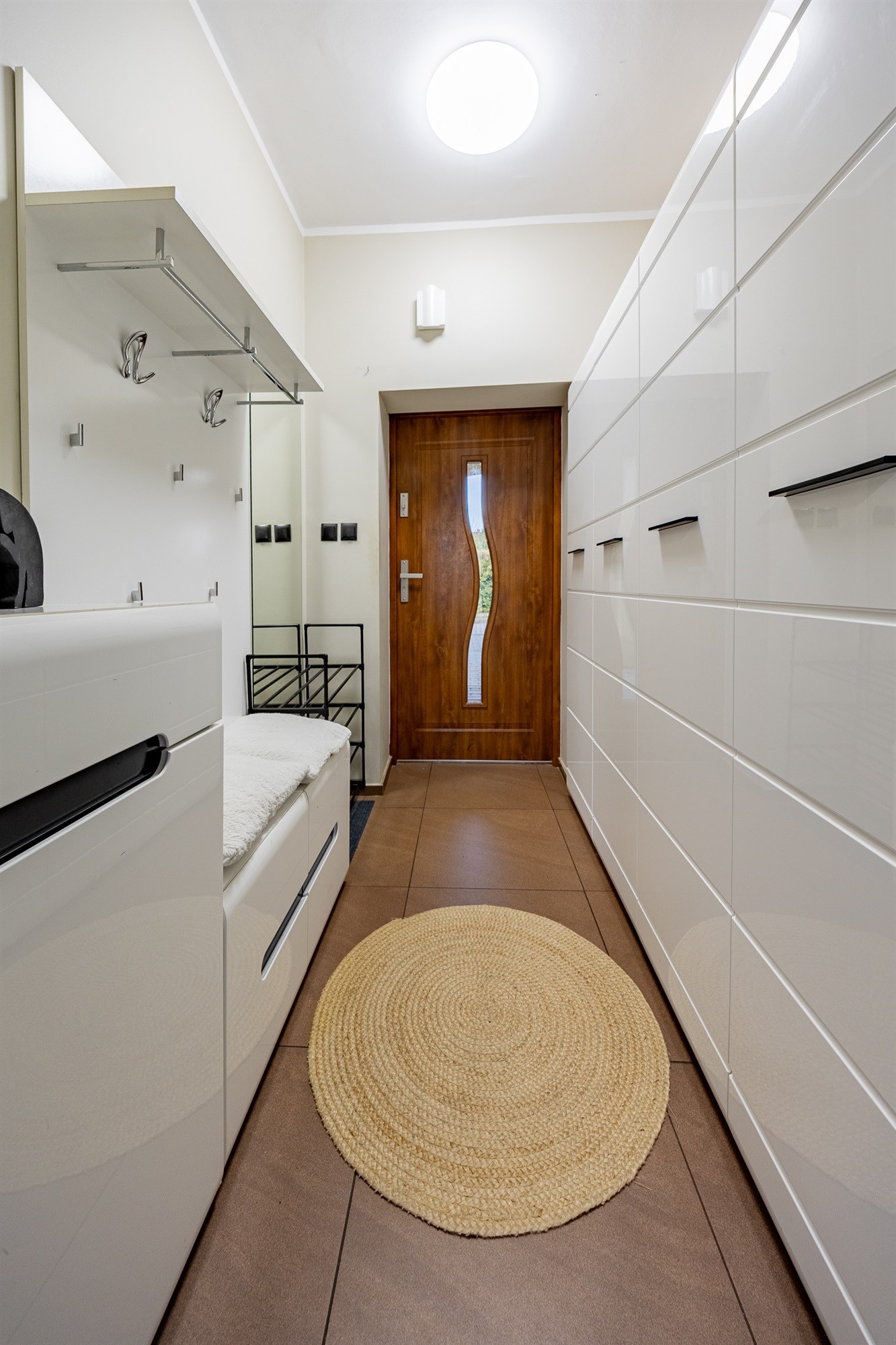Praktyczny Przedsionek: Duży przedsionek z pojemną zabudową – klucz do utrzymania idealnego porządku w strefie wejściowej.