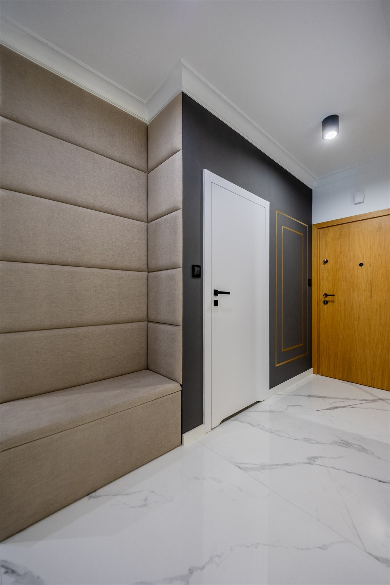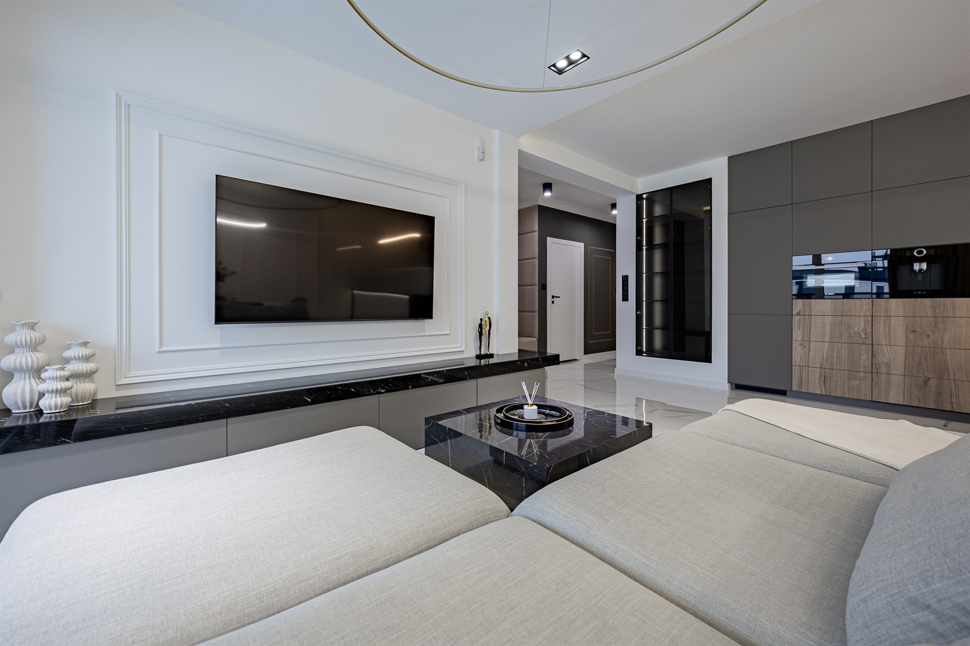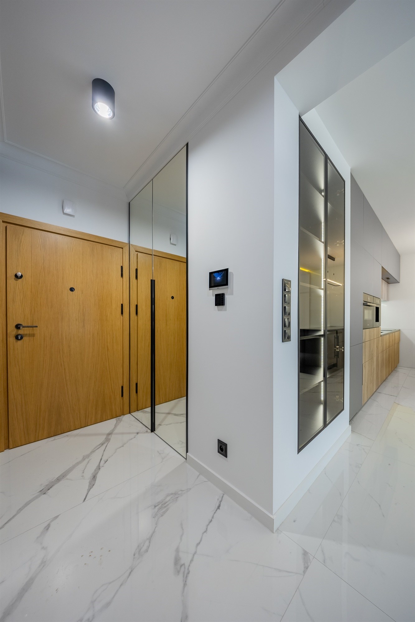 Całość dopełniają stylowe, białe drzwi, które podkreślają nowoczesny charakter wnętrza.