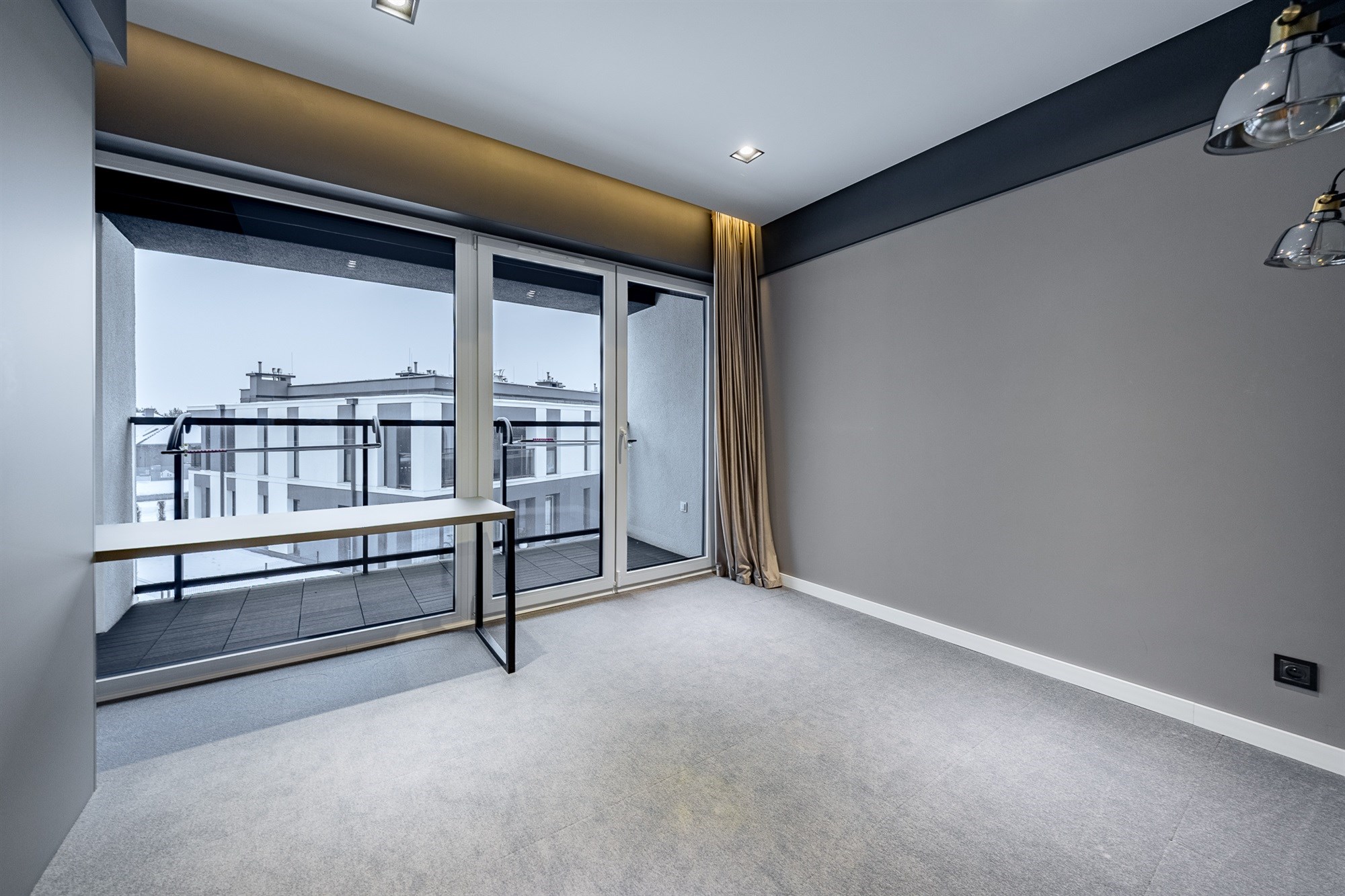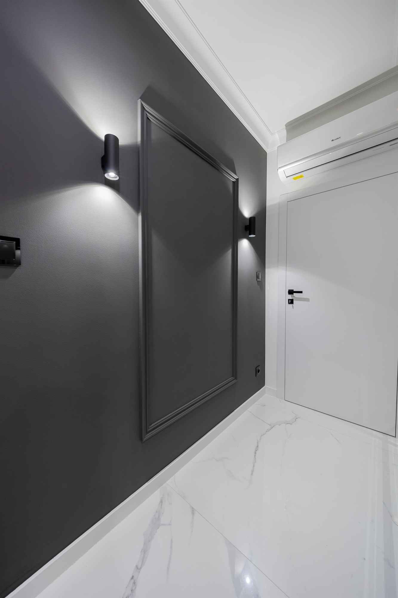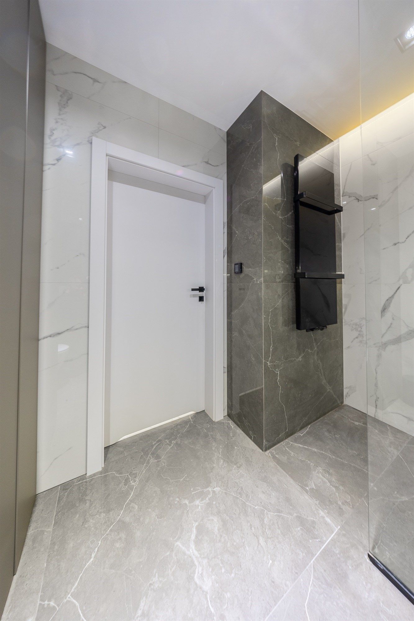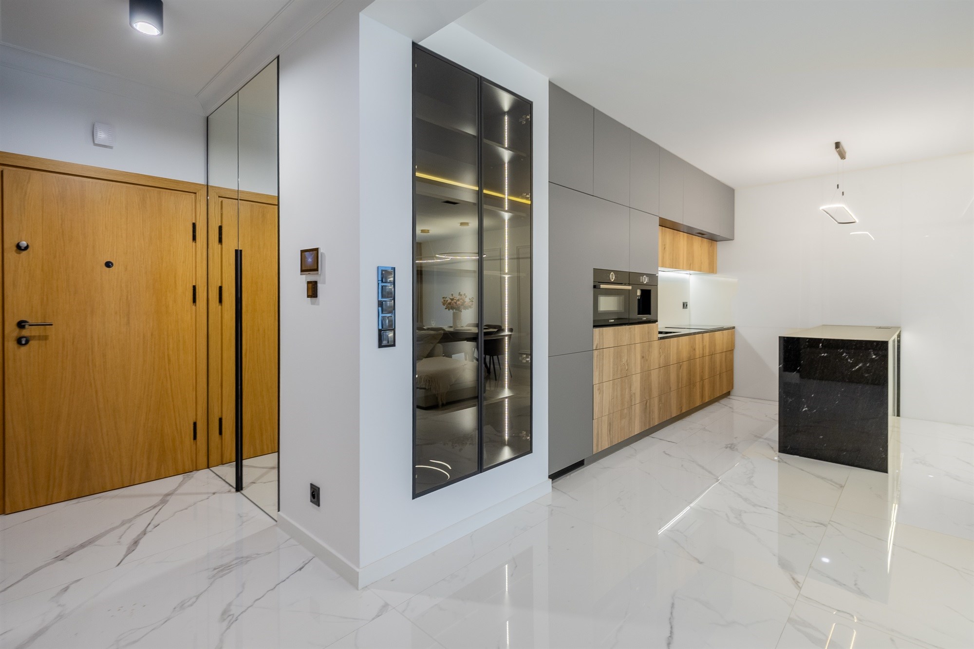 Całość dopełniają stylowe, białe drzwi, które podkreślają nowoczesny charakter wnętrza.