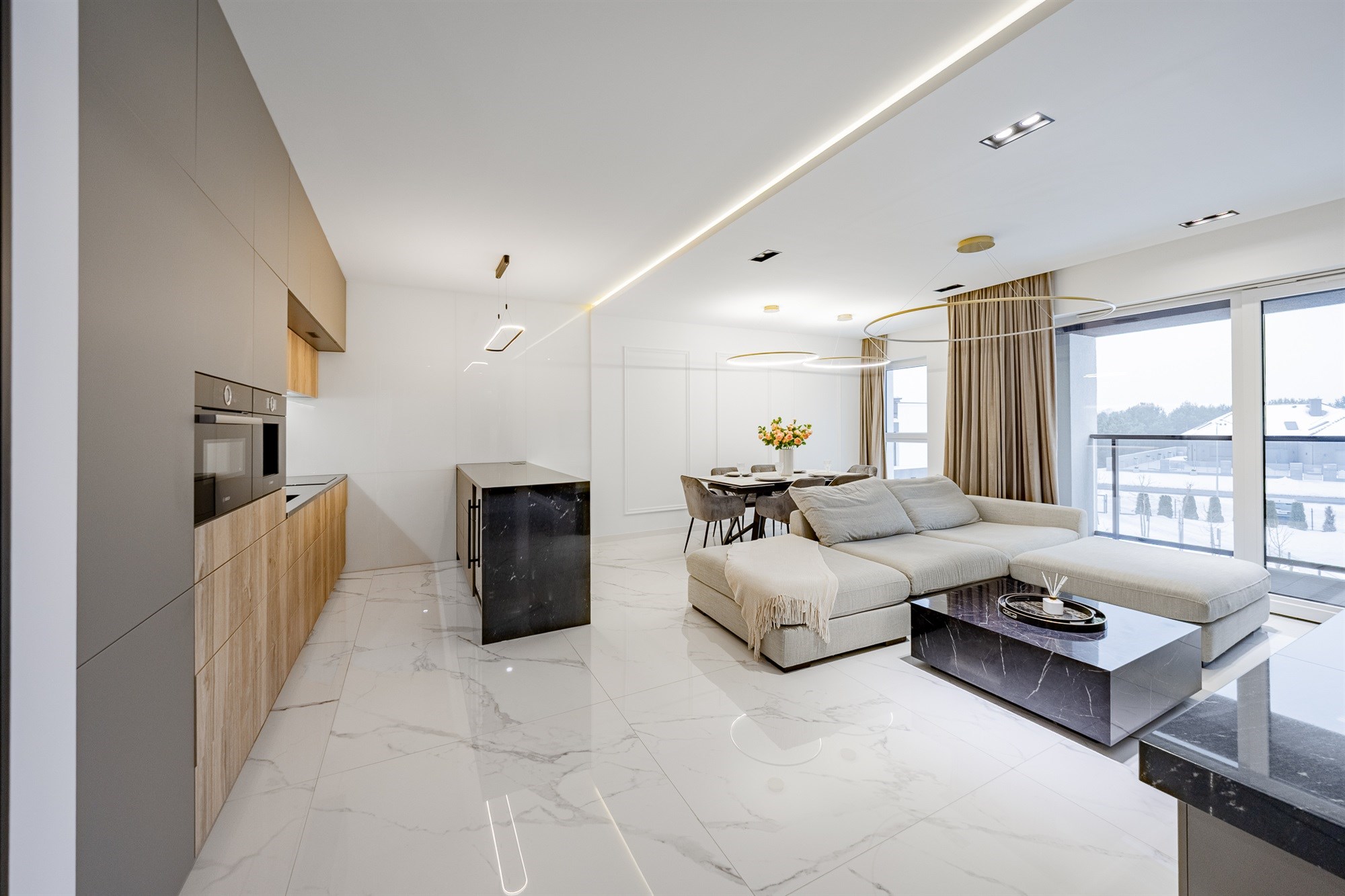 Centralnym punktem apartamentu jest przestronny salon z aneksem kuchennym (35,98 m²), z którego również prowadzi wyjście na balkon. To idealna przestrzeń do wspólnego spędzania czasu, relaksu i spotkań z bliskimi.