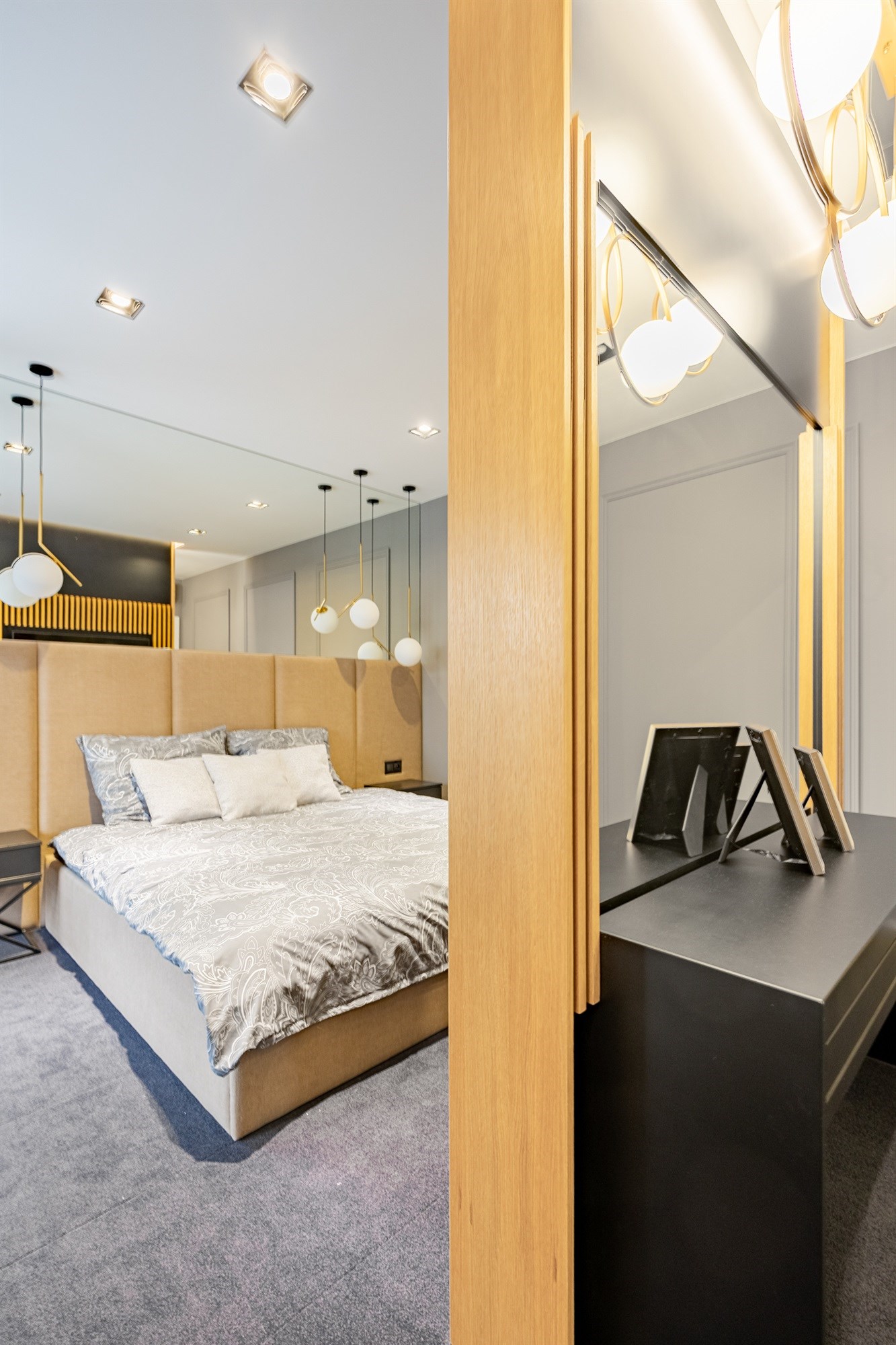 Wnętrze zostało urządzone w jasnych, eleganckich odcieniach, z ciepłymi akcentami drewna i miękkimi wykładzinami.