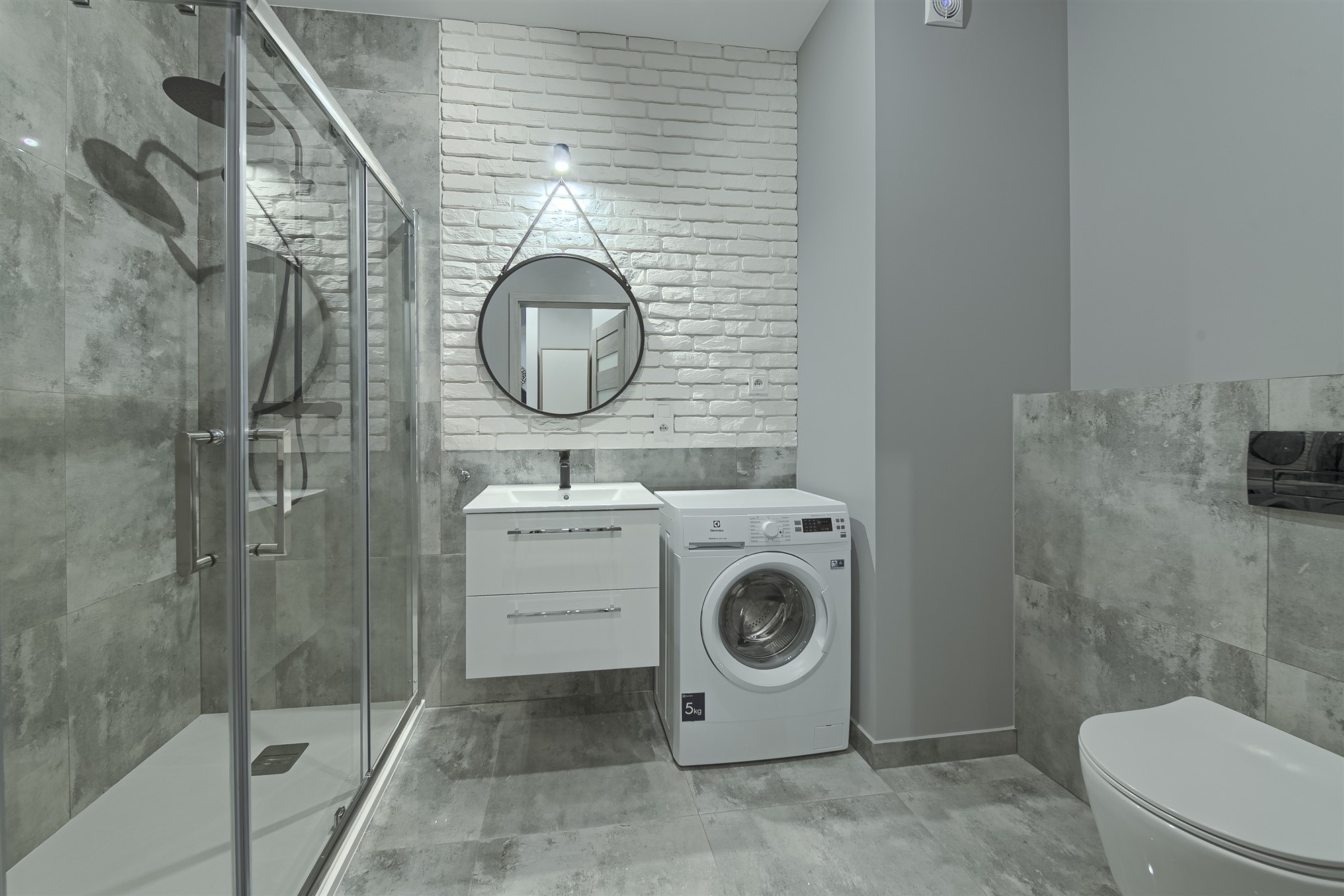 kabina prysznicowa, lustro, pralka, umywalka, WC