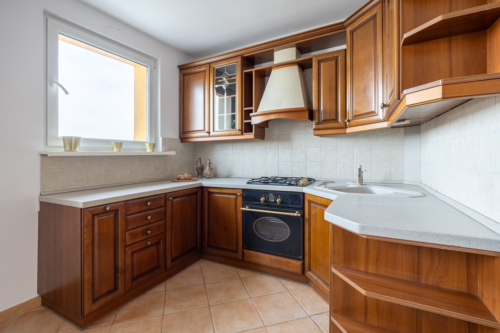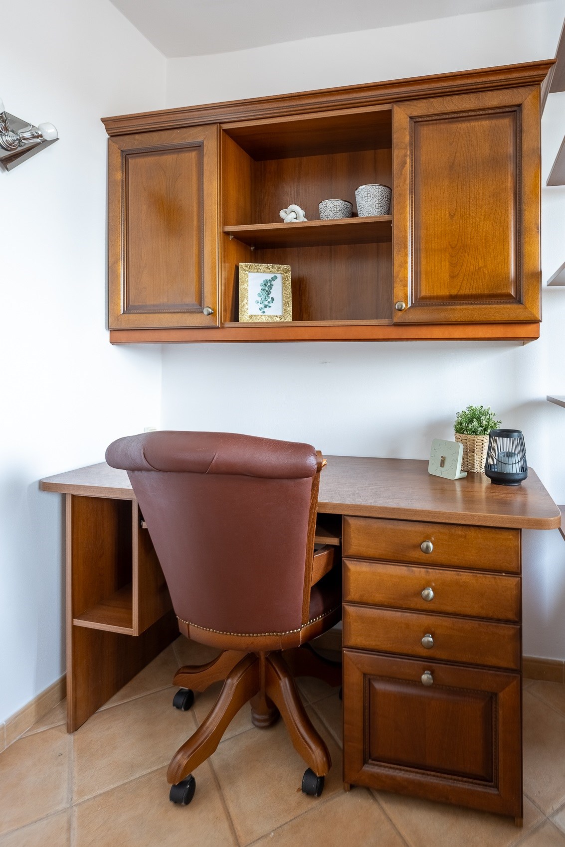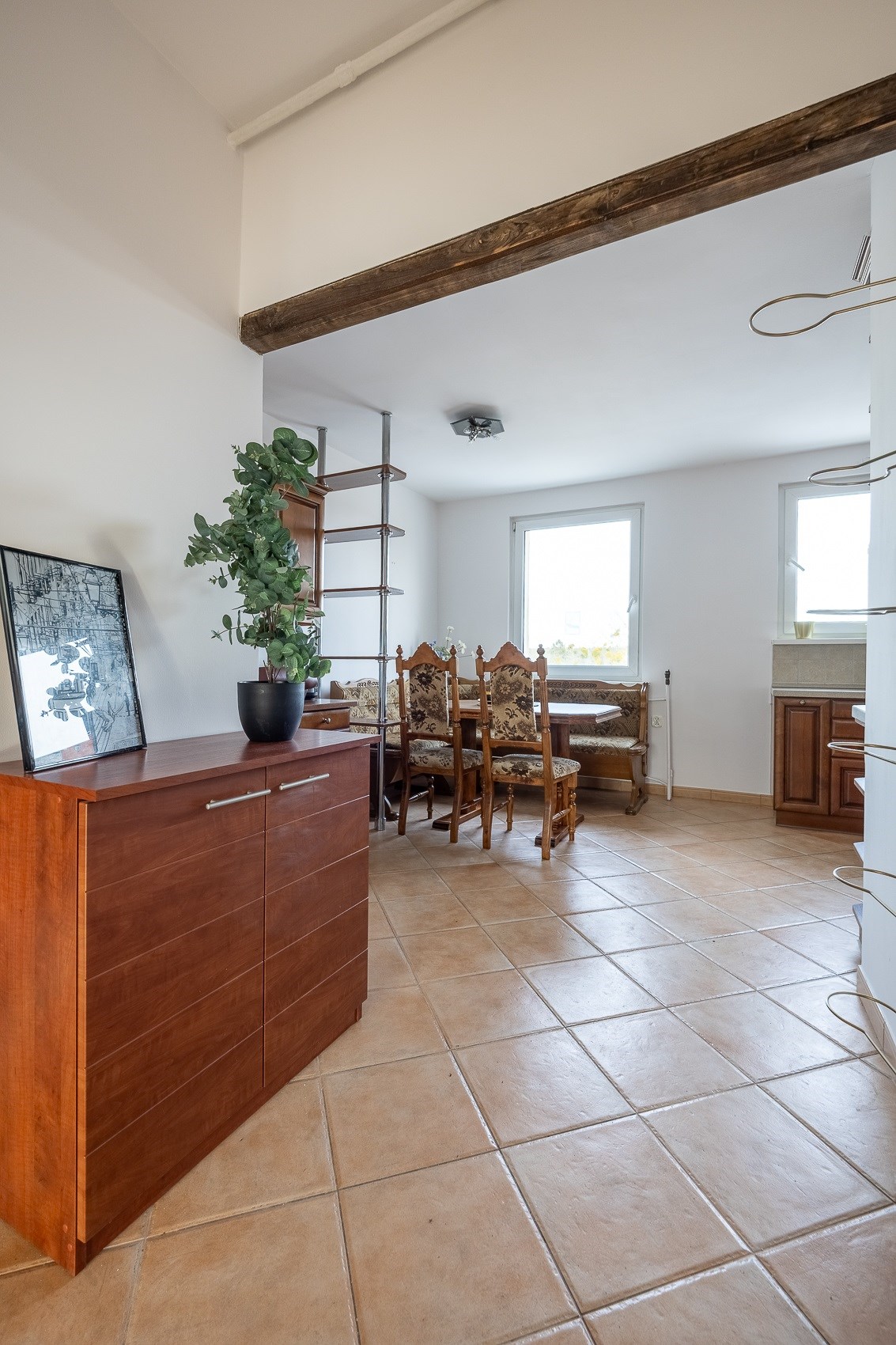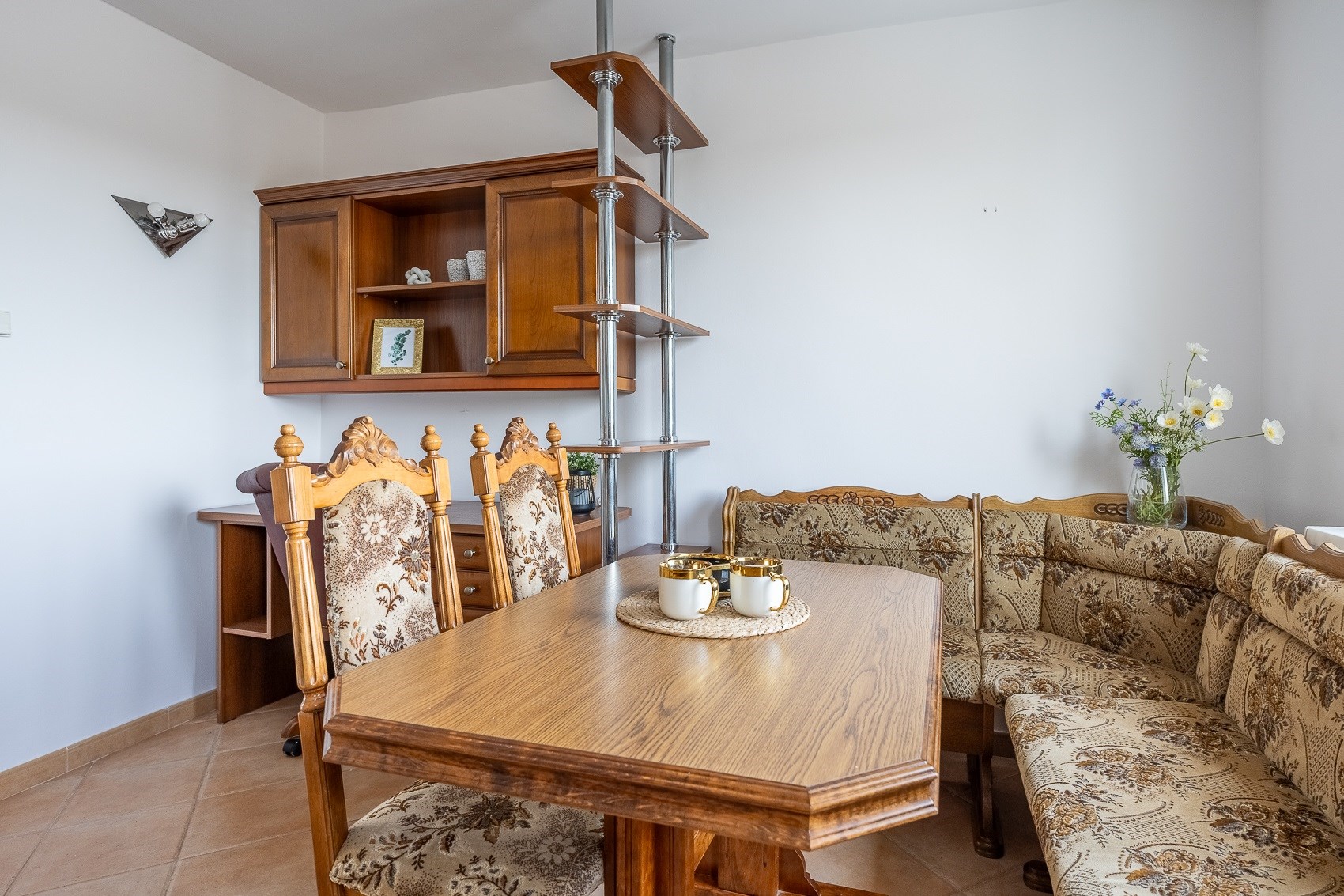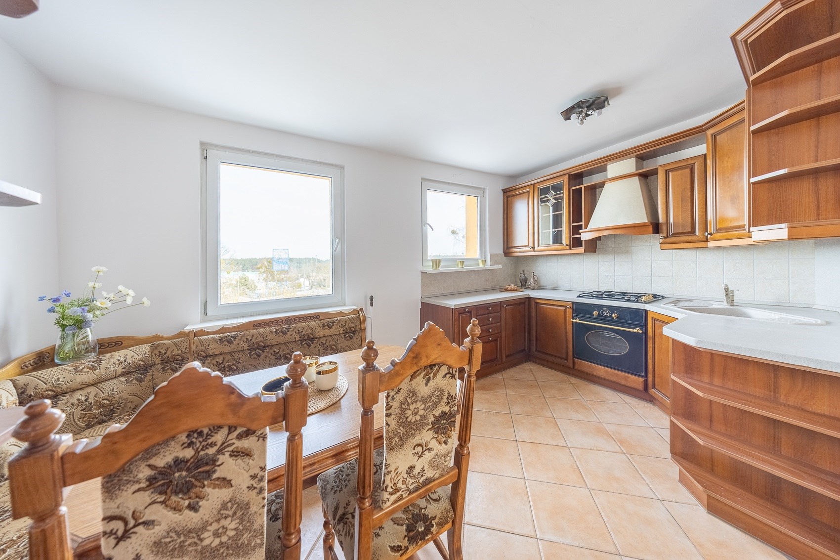 • Oddzielna, ciepła kuchnia z zabudową w wykończeniu orzech włoski. To miejsce, w którym przyjemnie pachnie domowym jedzeniem, a jadalnia i wygodne biurko tworzą przestrzeń zarówno do spotkań, jak i pracy.