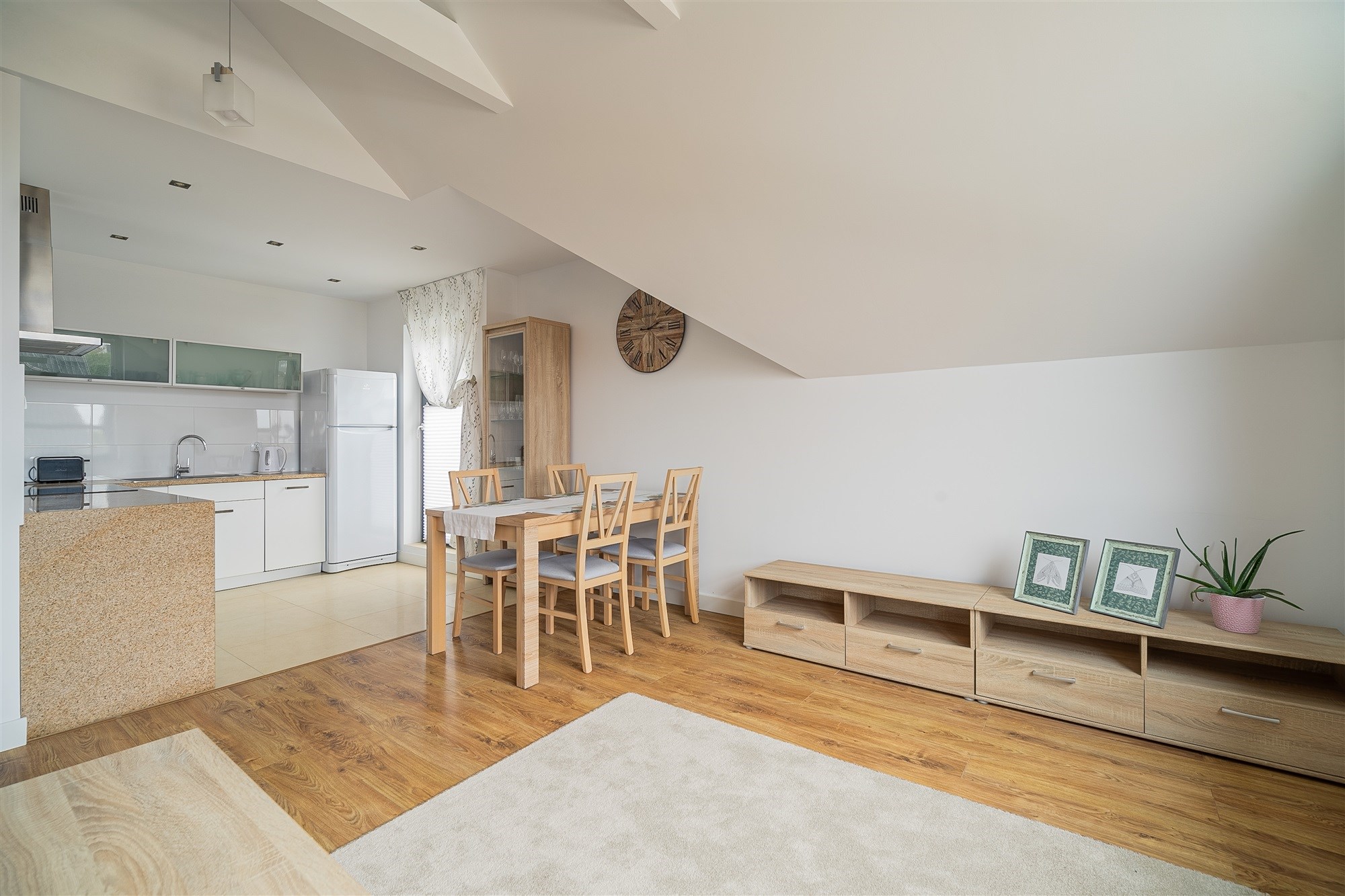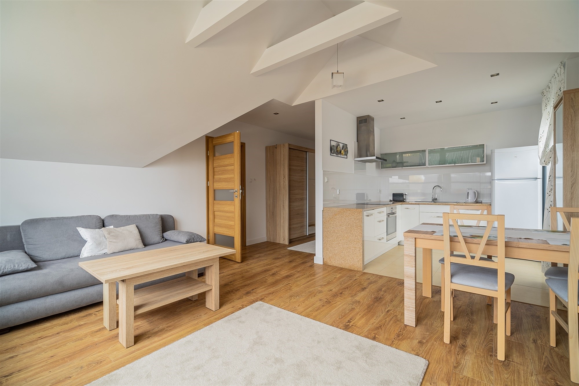 - Nowoczesna zabudowa kuchenna z wysokiej klasy sprzętem AGD (lodówka Indesit, płyta indukcyjna i piekarnik Amica, cicha zmywarka Bosch oraz okap).