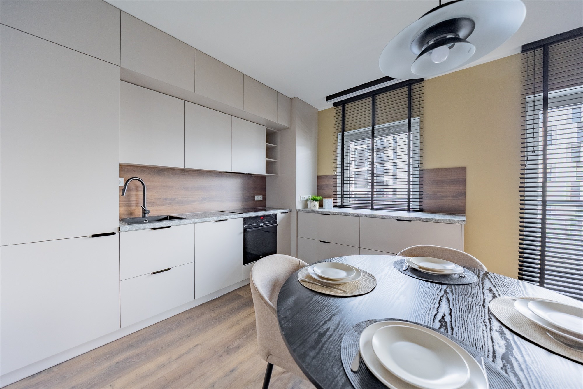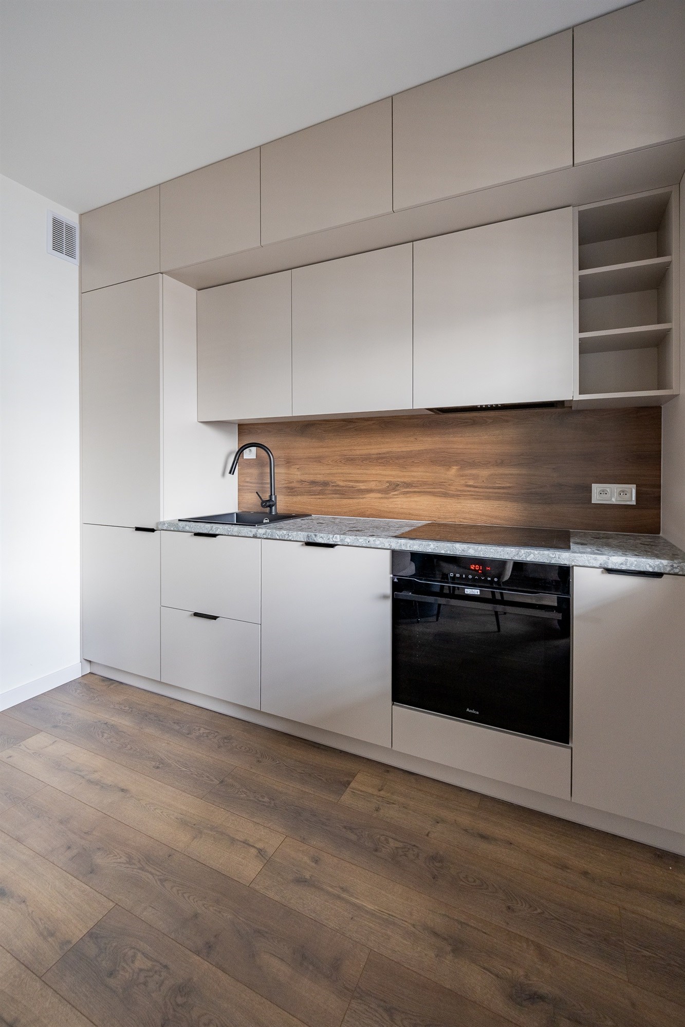 Przestronny salon z wyjściem na balkon i dużymi oknami zapewnia świetne doświetlenie wnętrza, a nowoczesna kuchnia została wyposażona we wszystkie niezbędne sprzęty AGD.