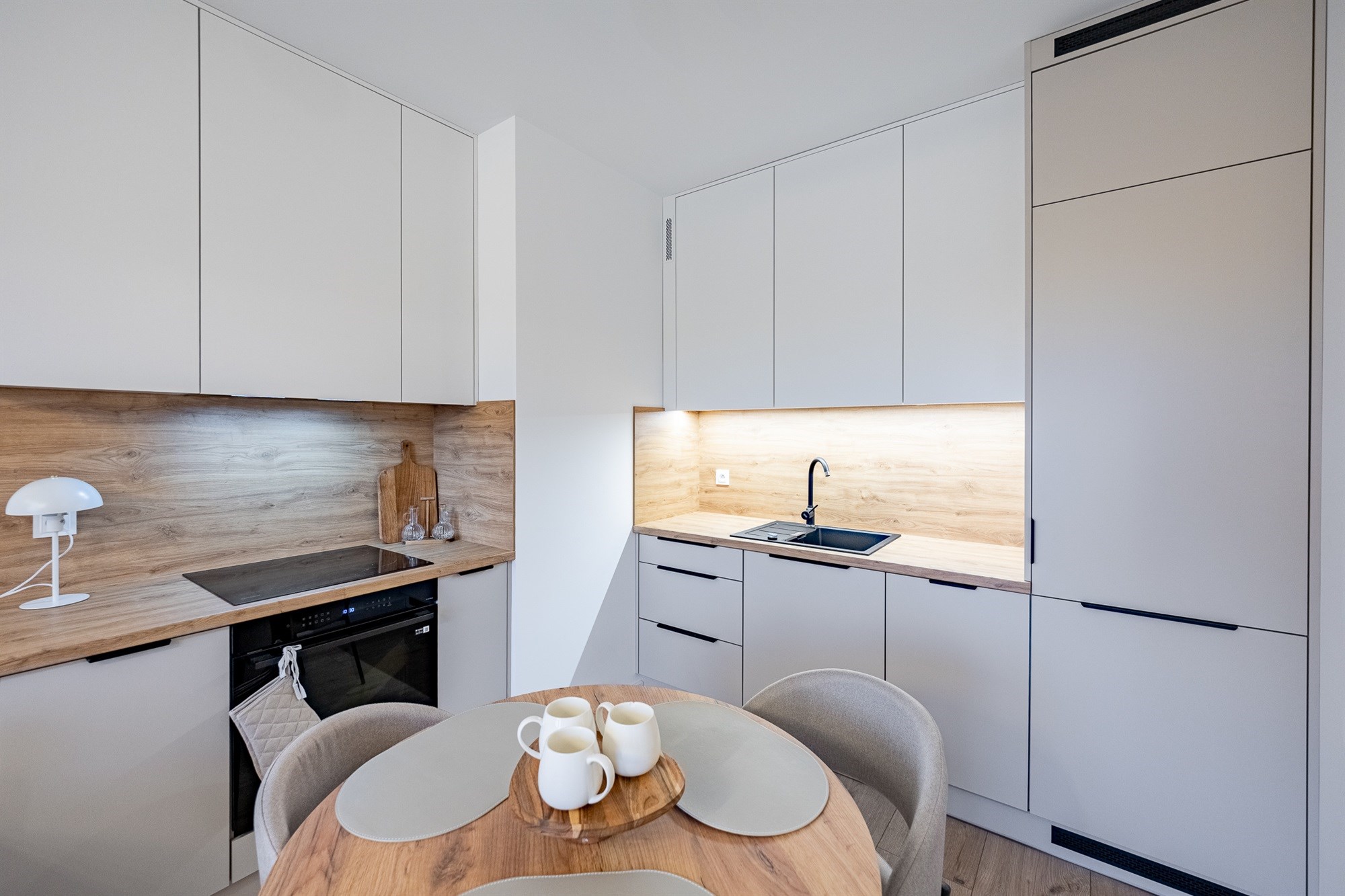 - Kuchnia – nowa zabudowa meblowa wraz z kompletnym sprzętem AGD (piekarnik, płyta, okap, zmywarka, lodówka). Całość utrzymana w nowoczesnej stylistyce, gotowa do codziennego użytkowania.