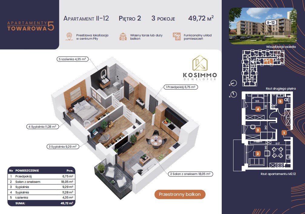 Przedmiotem oferty jest mieszkanie o powierzchni 49,72 m2 znajdujące się na II piętrze budynku. W skład mieszkania wchodzi: salon z aneksem kuchennym o pow. 18,05 m2 , pokój o pow. 9,29 m2,pokój o pow. 11,28 m2 , łazienka o pow. 4,35 m2, przedpokój o pow. 6,75 m2