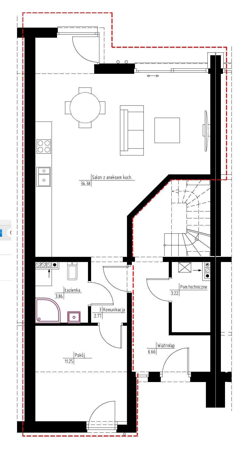 - Salon z aneksem kuchennym – przestrzeń 36,38 m2 z bezpośrednim wyjściem do ogródka.