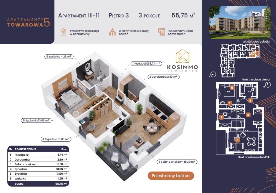 Przedmiotem oferty jest mieszkanie o powierzchni 55,75 m2 znajdujące się na III piętrze budynku. W skład mieszkania wchodzi: salon z aneksem kuchennym o pow. 18,30 m2 pokój o pow. 10,60 m2, pokój o pow. 13.06 m2, łazienka o pow. 4,25 m2, przedpokój o pow. 6,74 m2