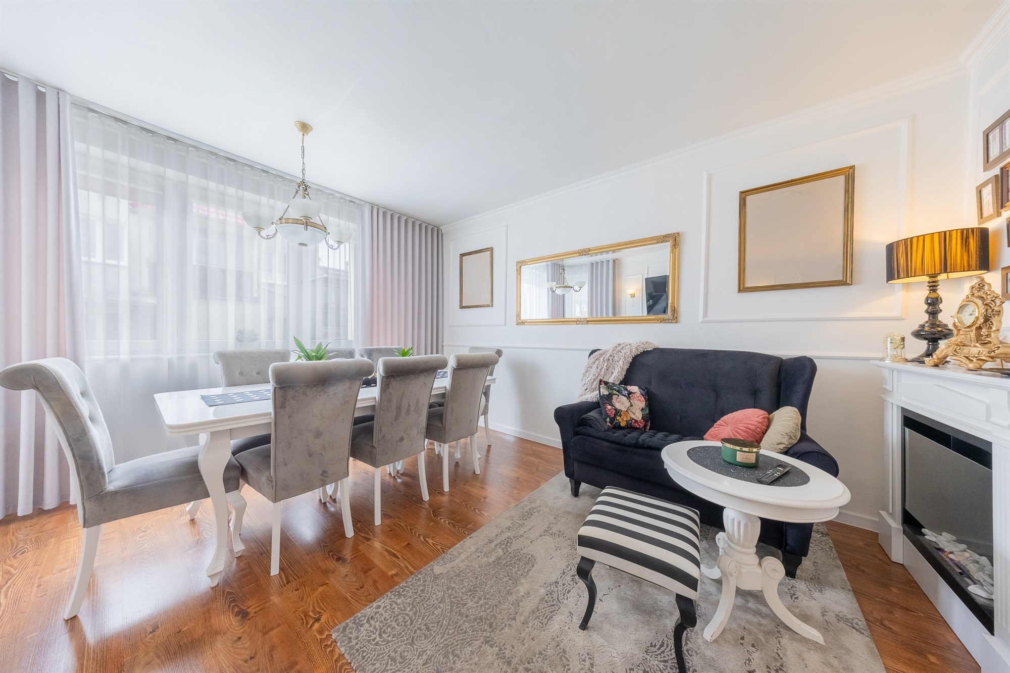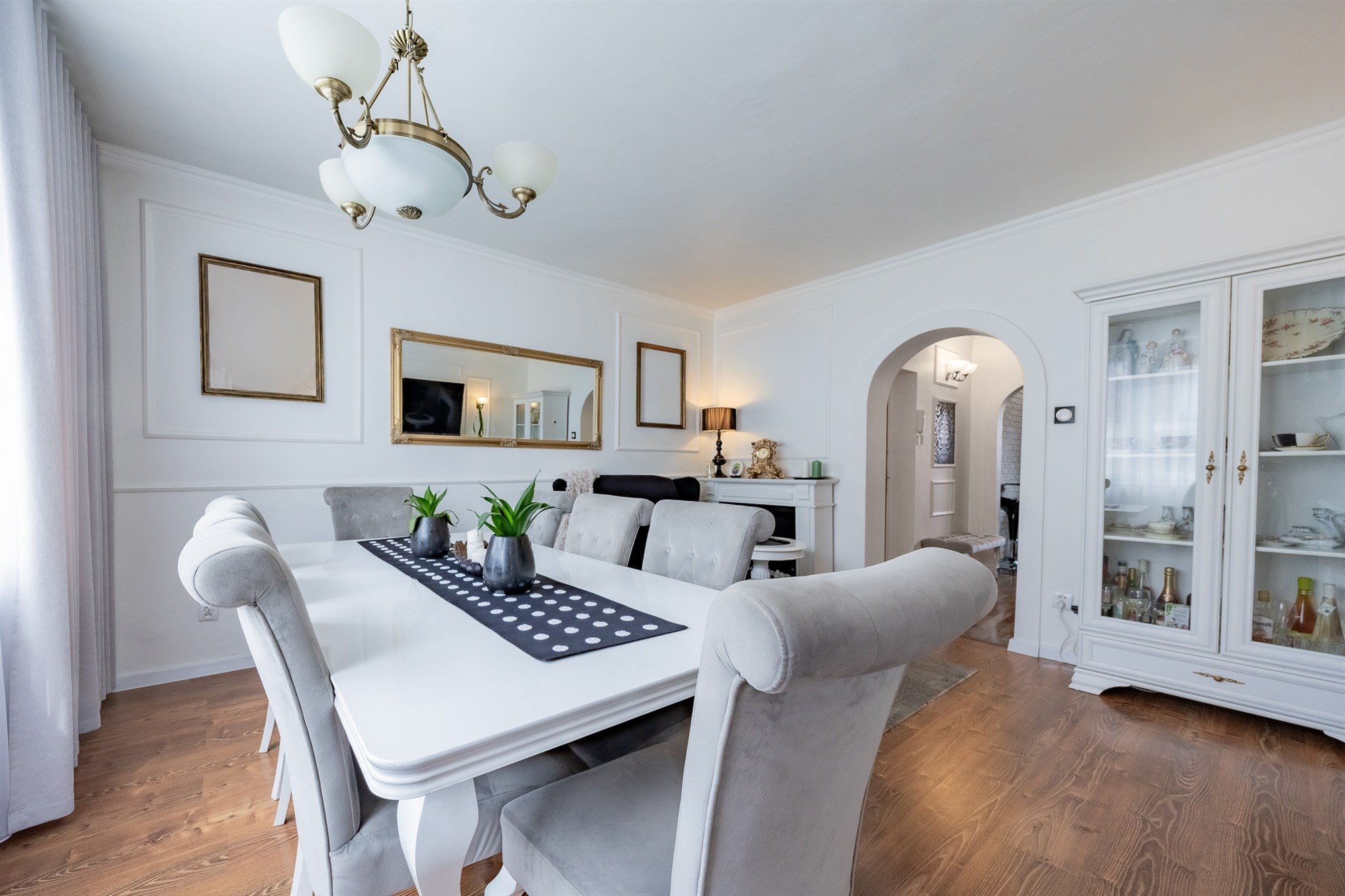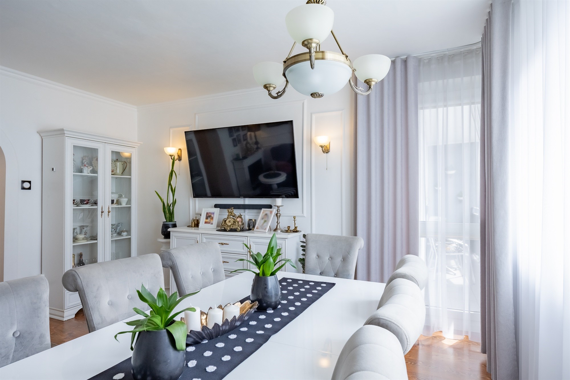 Wnętrze zostało stylowo wykończone – gładzie na ścianach, elegancka sztukateria, spójna i ponadczasowa estetyka, która tworzy przytulną, reprezentacyjną przestrzeń.