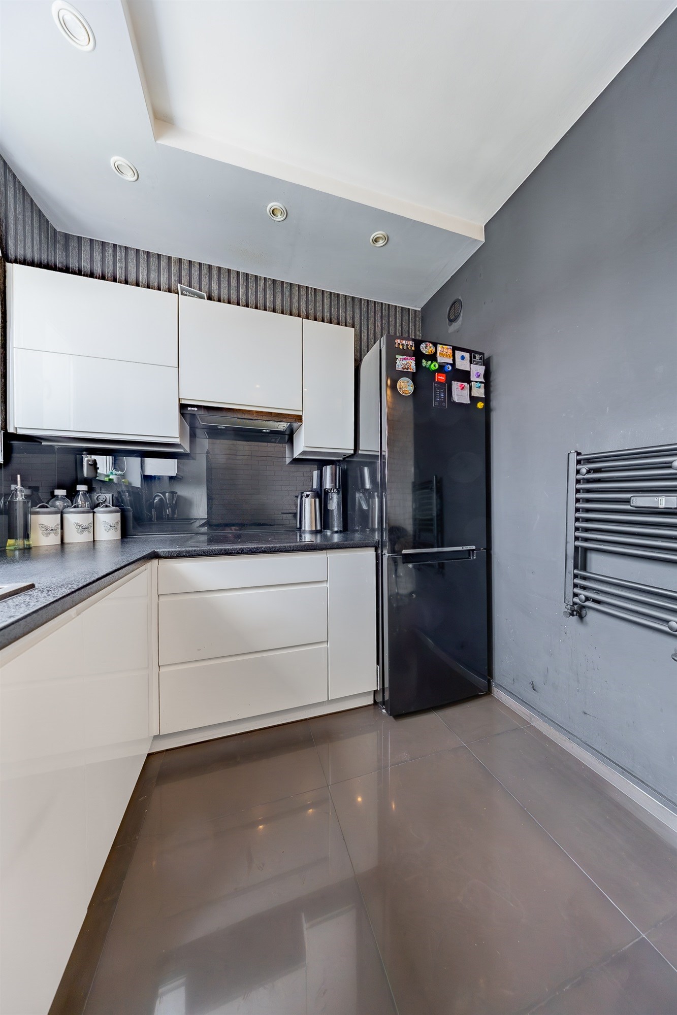 Osobna kuchnia o powierzchni ponad 7 m², z oknem i miejscem na śniadanie, została zabudowana meblami pod wymiar i wyposażona w wysokiej klasy sprzęt AGD:
