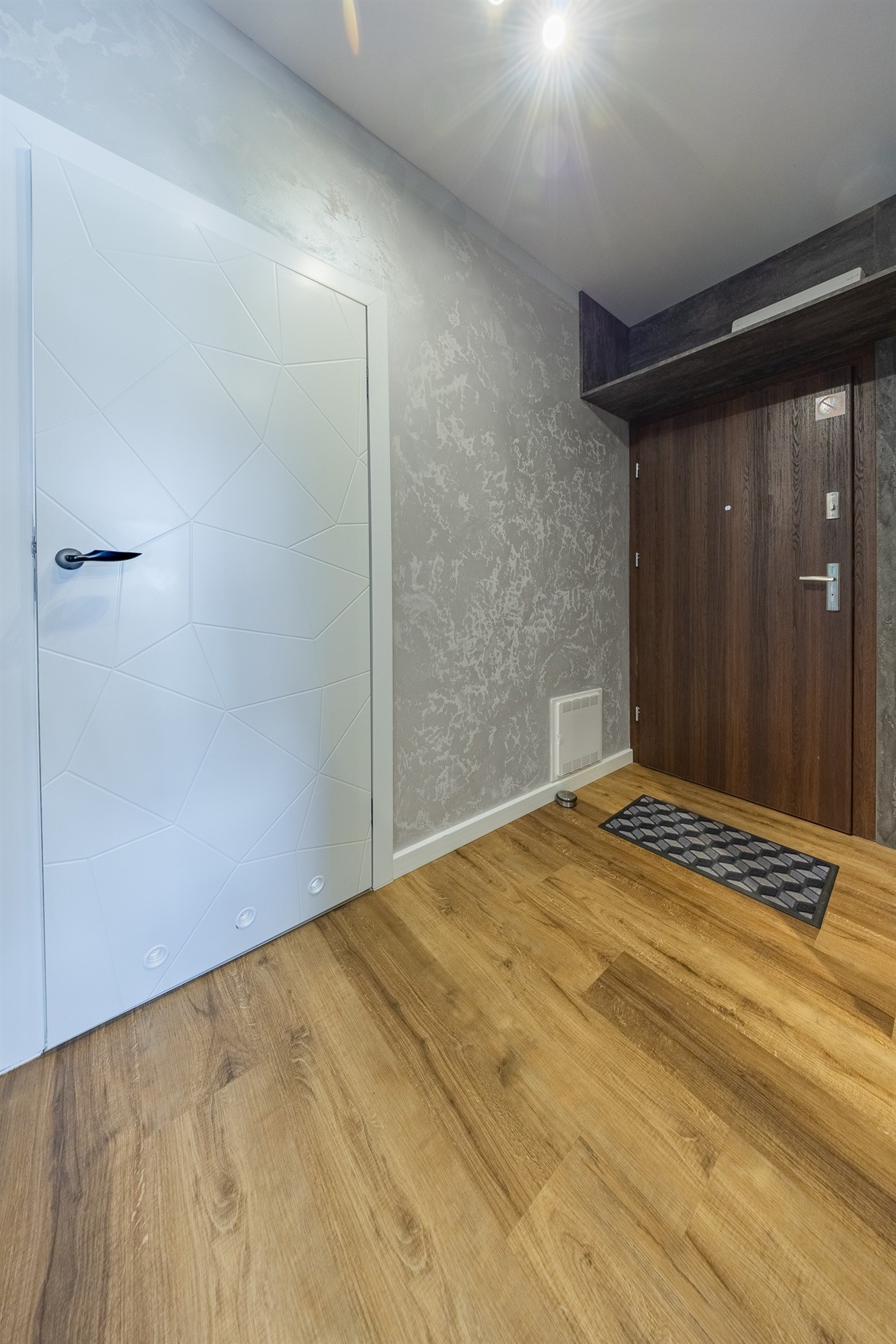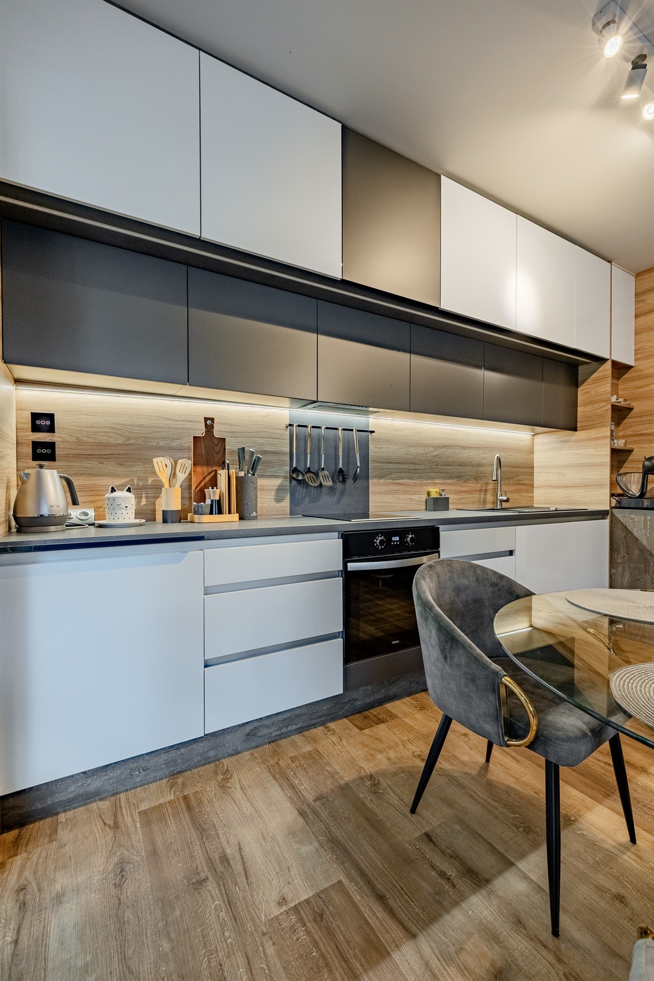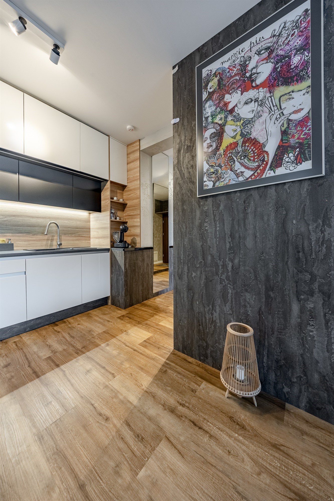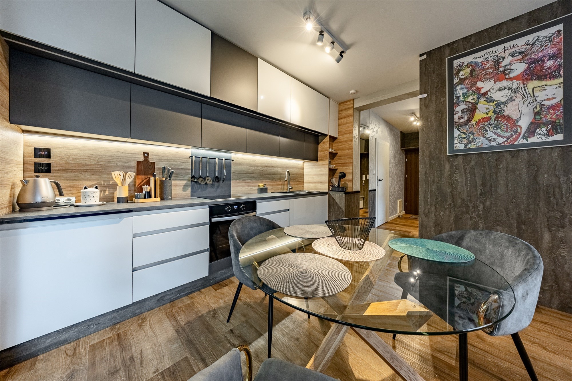 - salon z aneksem kuchennym (ok. 21,5 m²) – z nowoczesną zabudową na wymiar i pełnym wyposażeniem AGD,