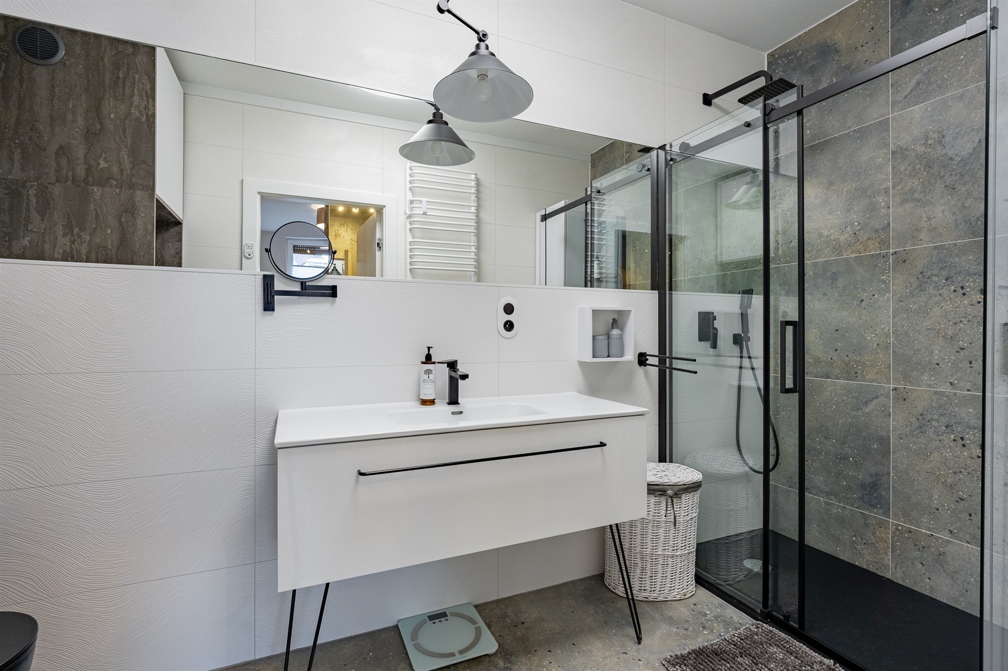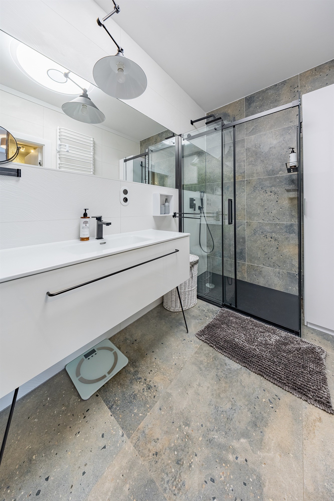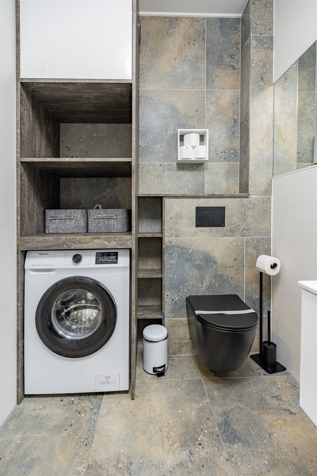 - łazienka (6,15 m²) z kabiną prysznicową i meblami w zabudowie,