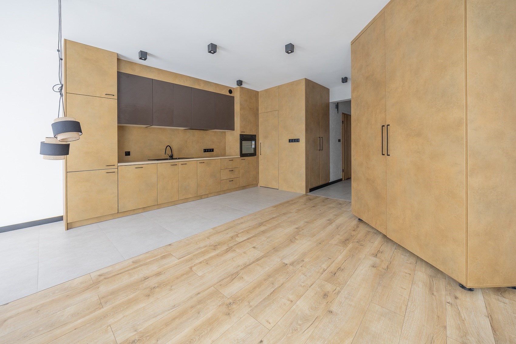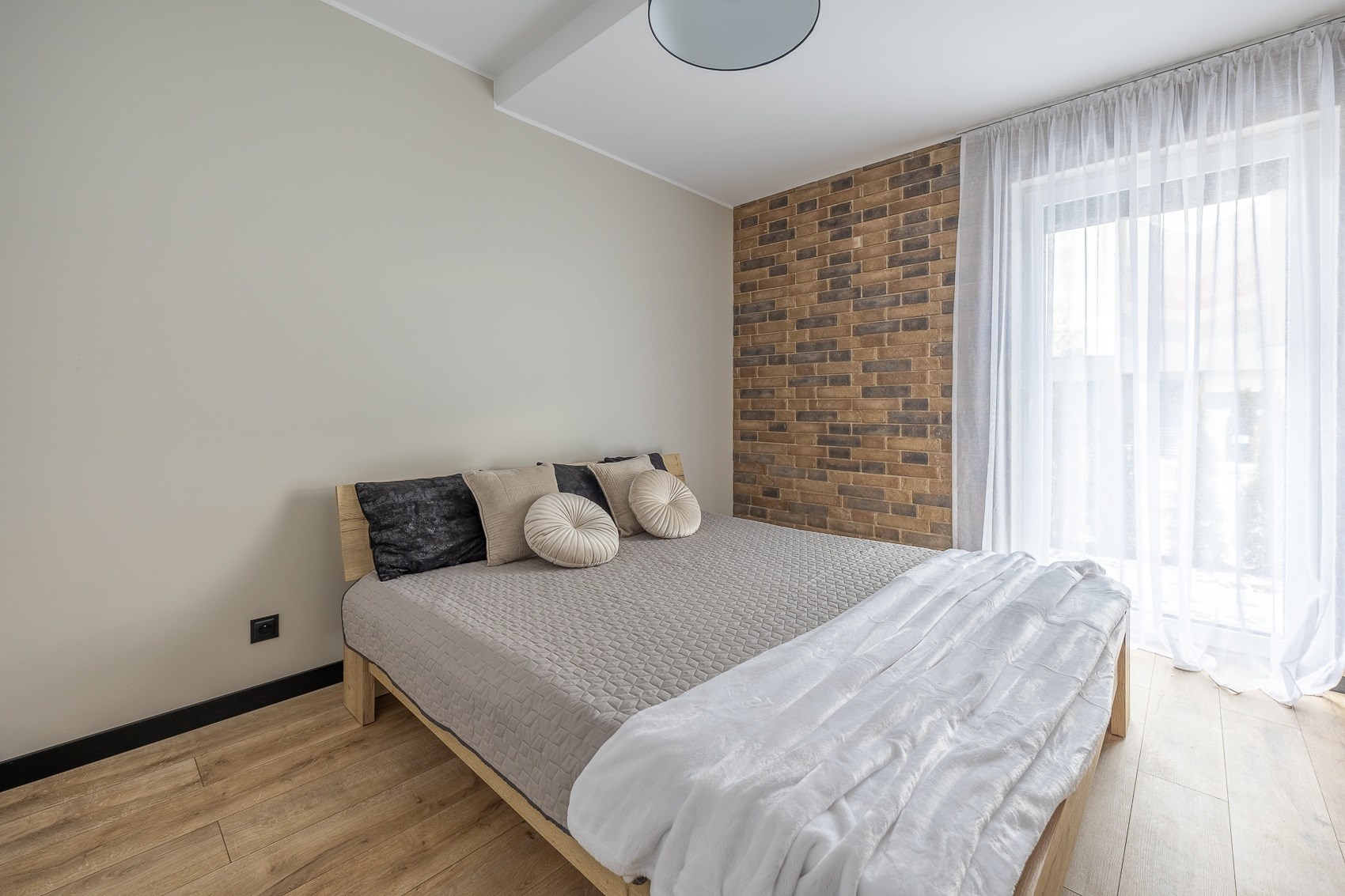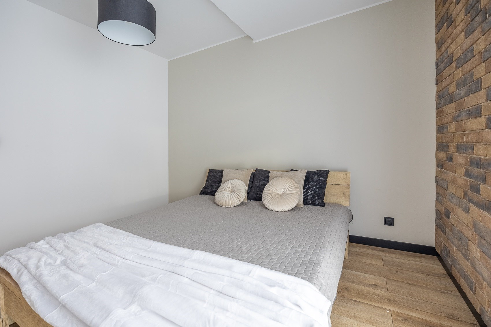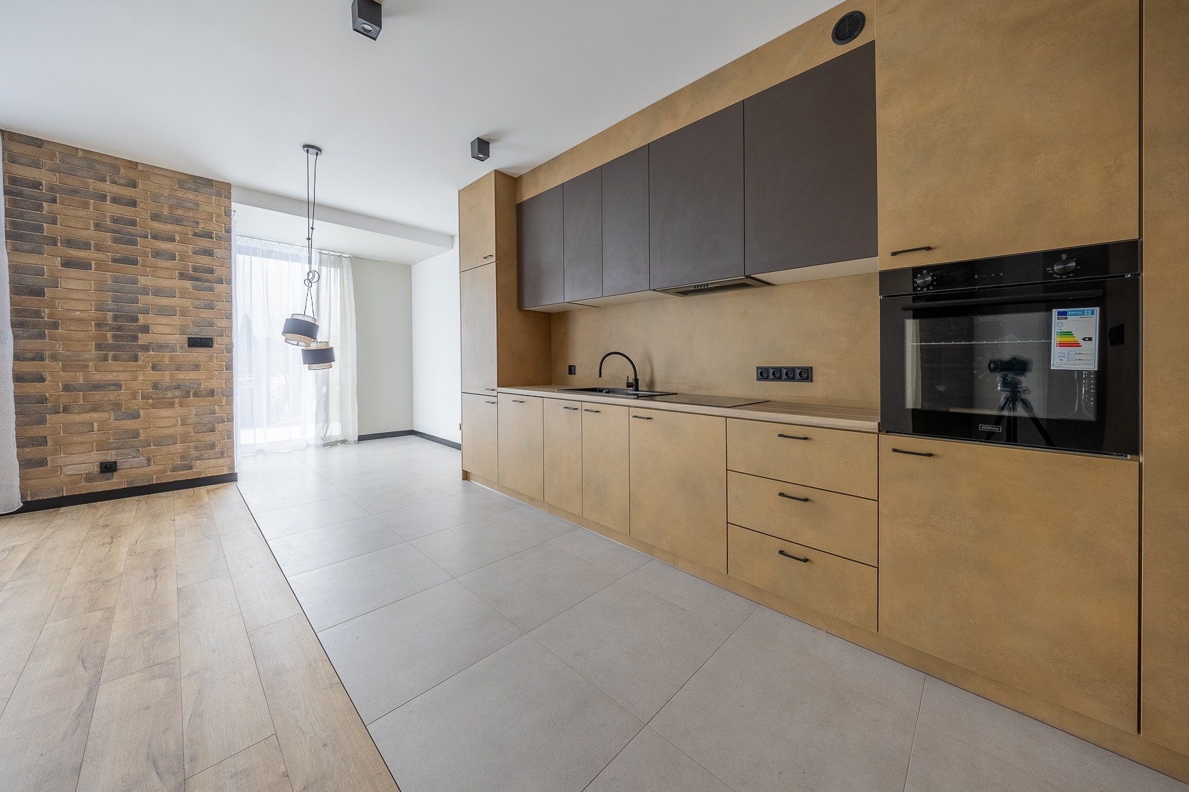 Sercem mieszkania jest duża, jasna strefa dzienna. Nowoczesna kuchnia w zabudowie, matowe fronty, elegancki blat, czarna armatura i nowy sprzęt AGD tworzą przestrzeń, która zachwyca estetyką i funkcjonalnością. Ceglana ściana dodaje wnętrzu charakteru, a duże okna wpuszczają mnóstwo naturalnego światła. -