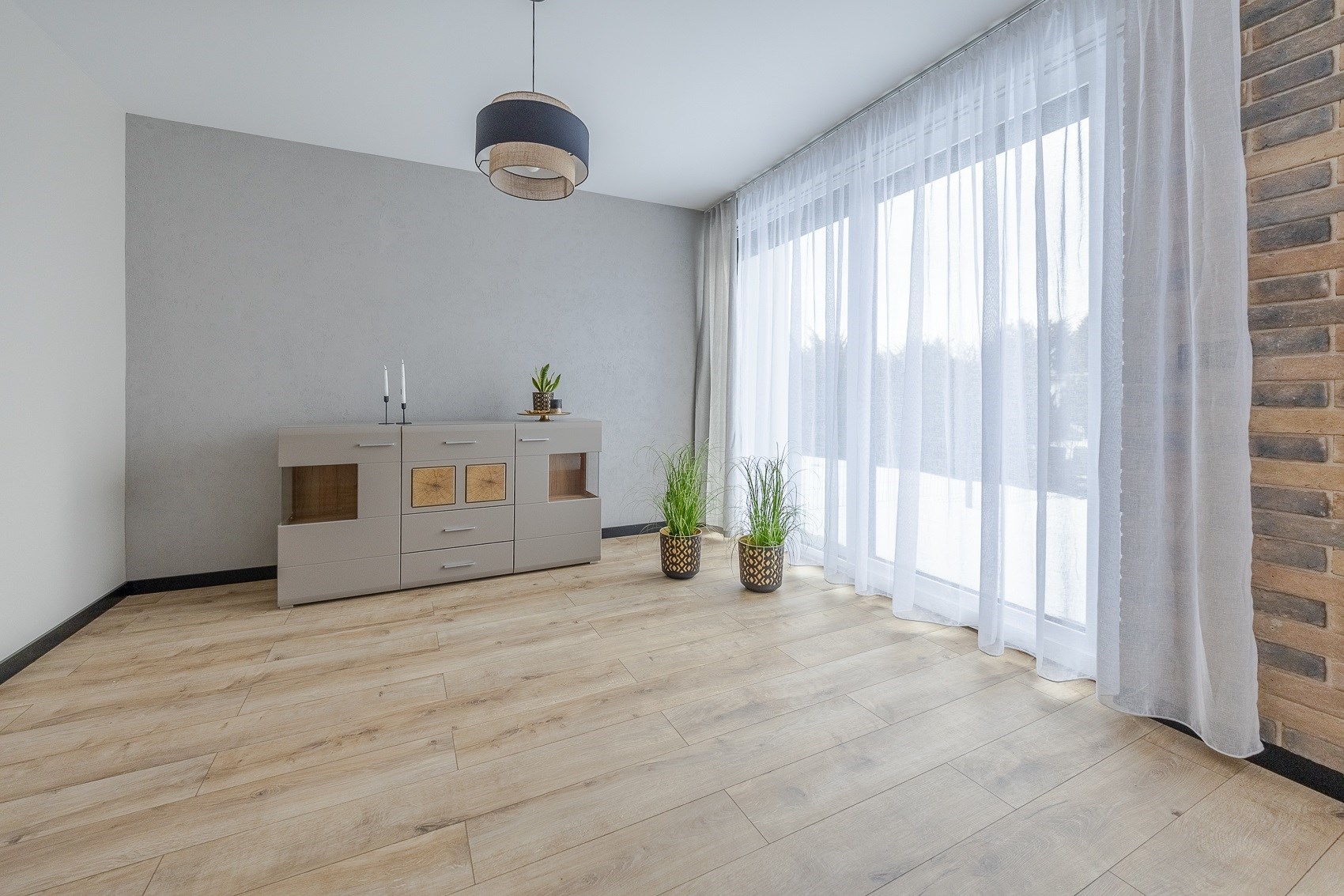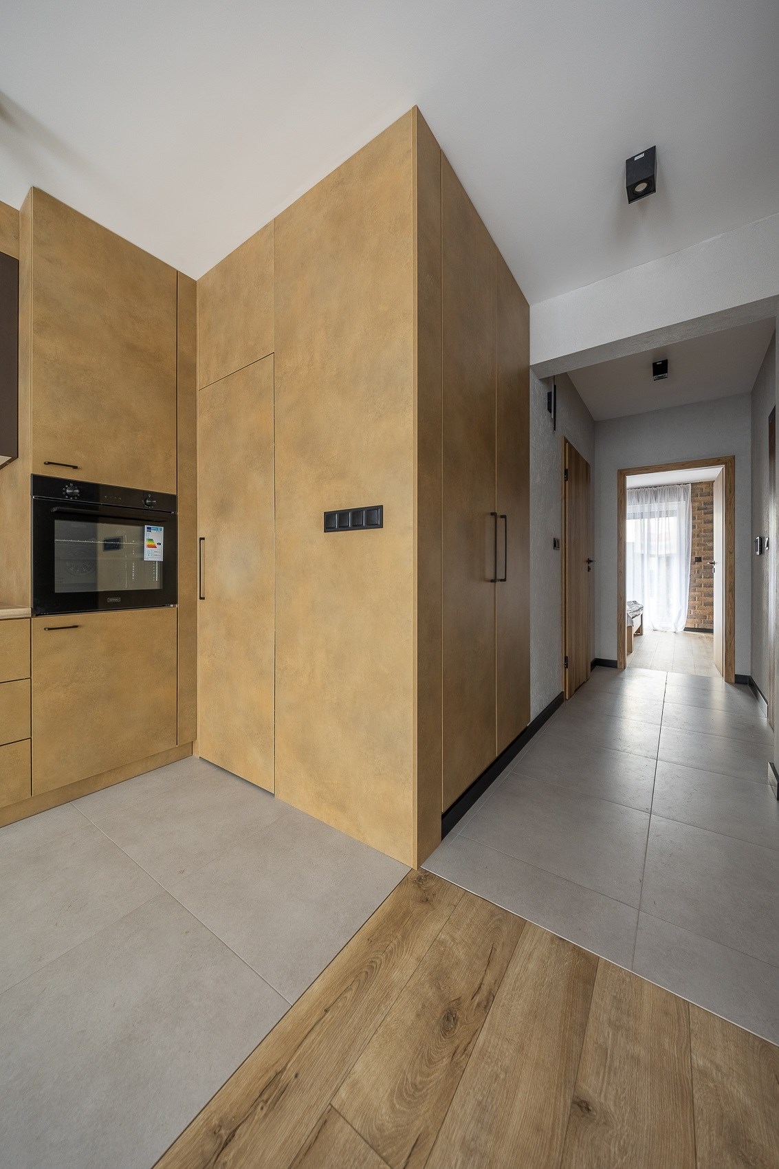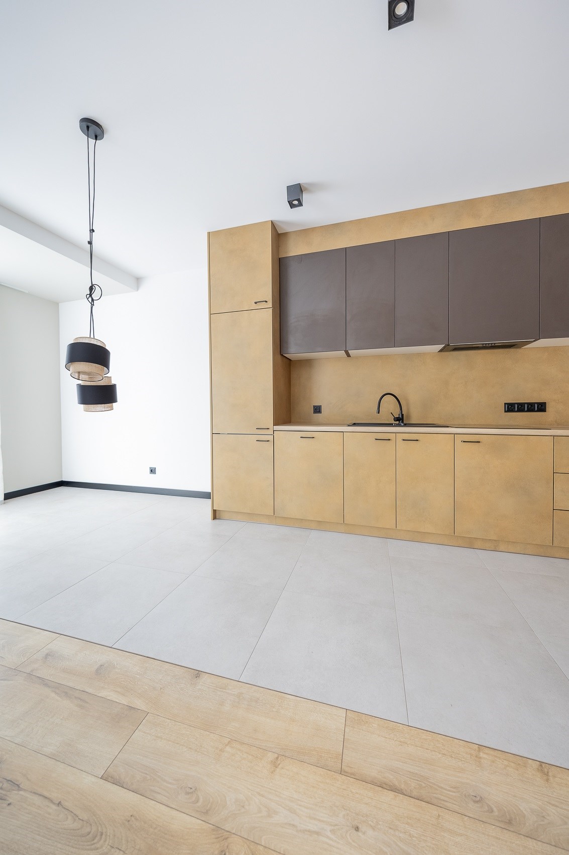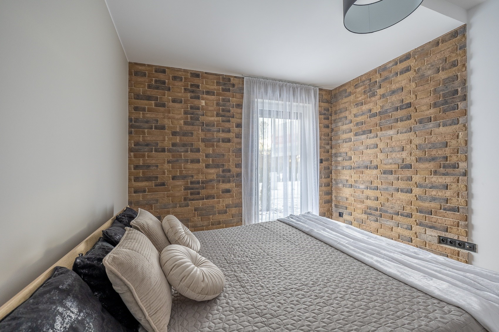 Sercem mieszkania jest duża, jasna strefa dzienna. Nowoczesna kuchnia w zabudowie, matowe fronty, elegancki blat, czarna armatura i nowy sprzęt AGD tworzą przestrzeń, która zachwyca estetyką i funkcjonalnością. Ceglana ściana dodaje wnętrzu charakteru, a duże okna wpuszczają mnóstwo naturalnego światła. -