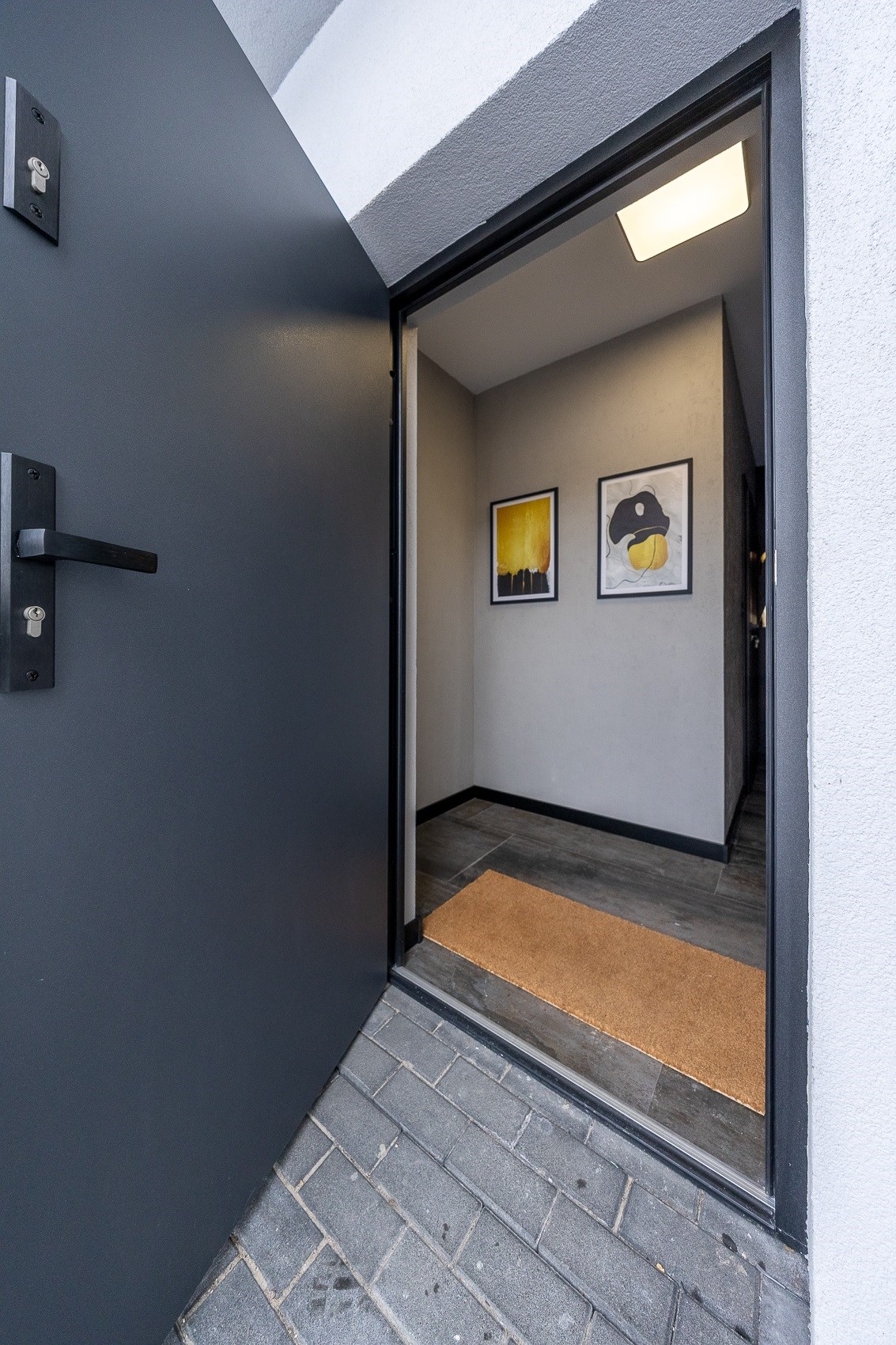 Wiatrołap i pomieszczenie techniczne z piecem dwufunkcyjnym, licznikami i skrzynką elektryczną - praktyczne rozwiązanie, które nie zabiera miejsca w mieszkaniu.