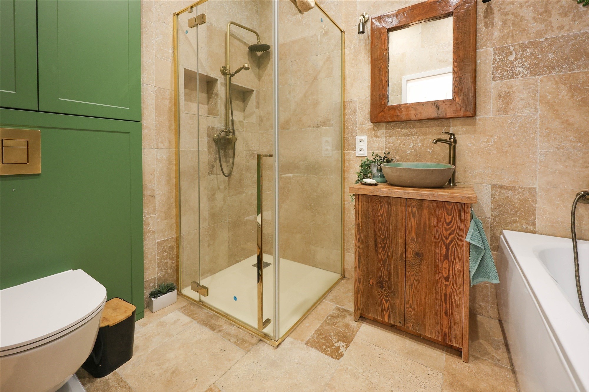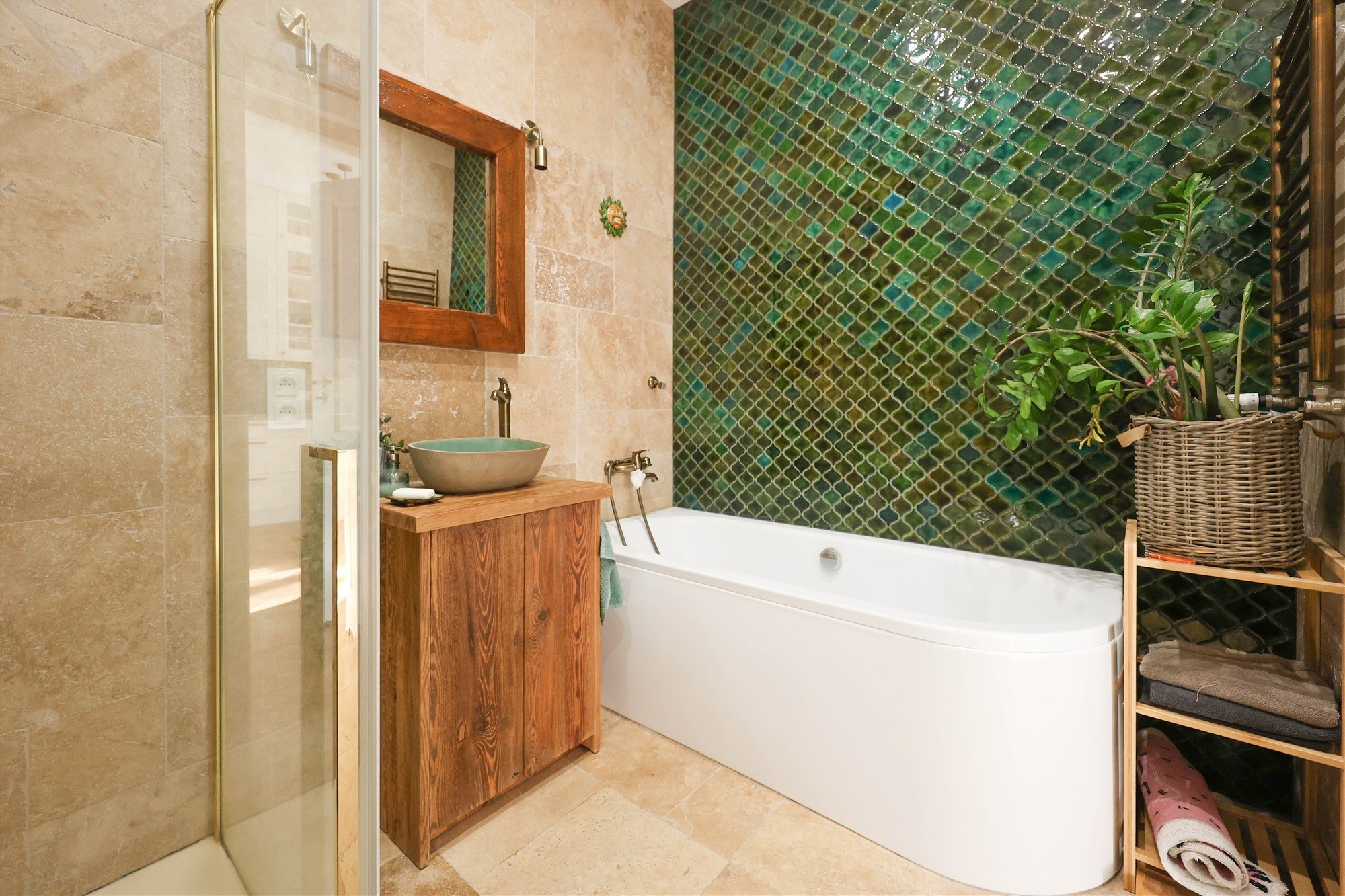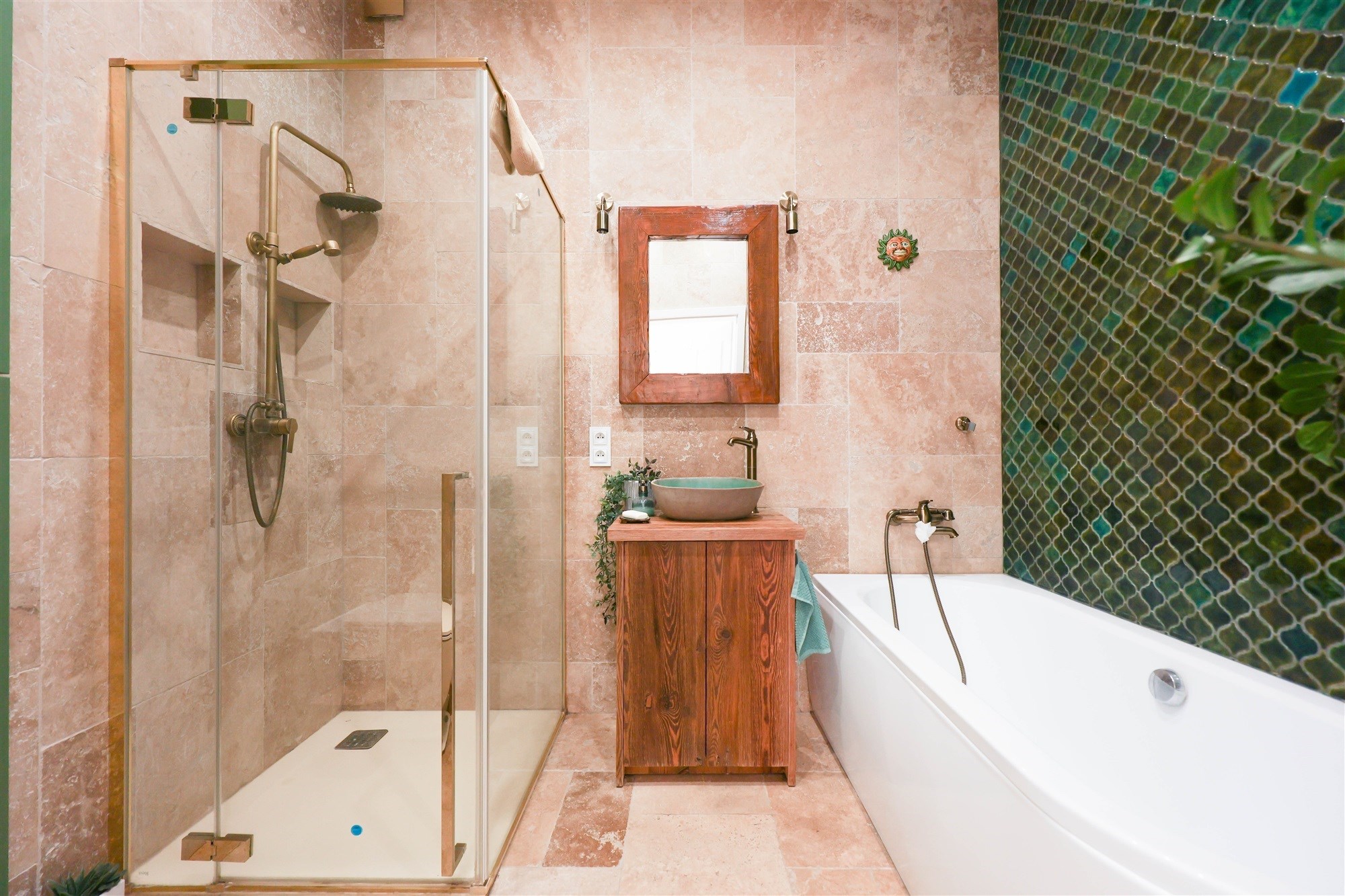 - Łazienka - stylowe wnętrze z wanną i prysznicem, wykończone z dbałością o detale.