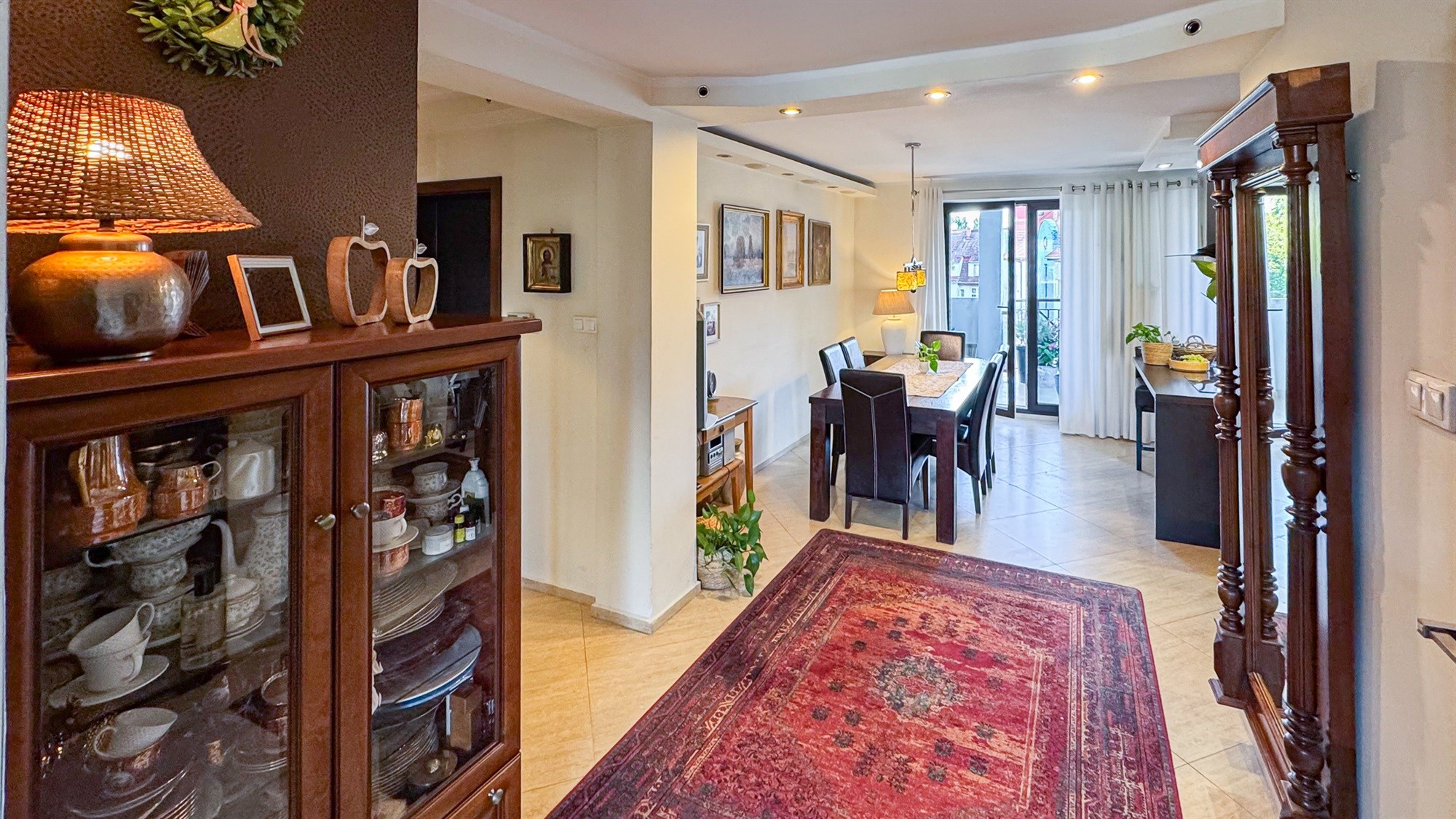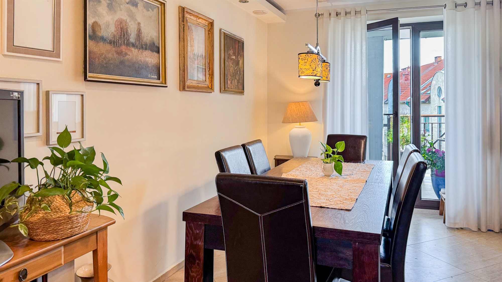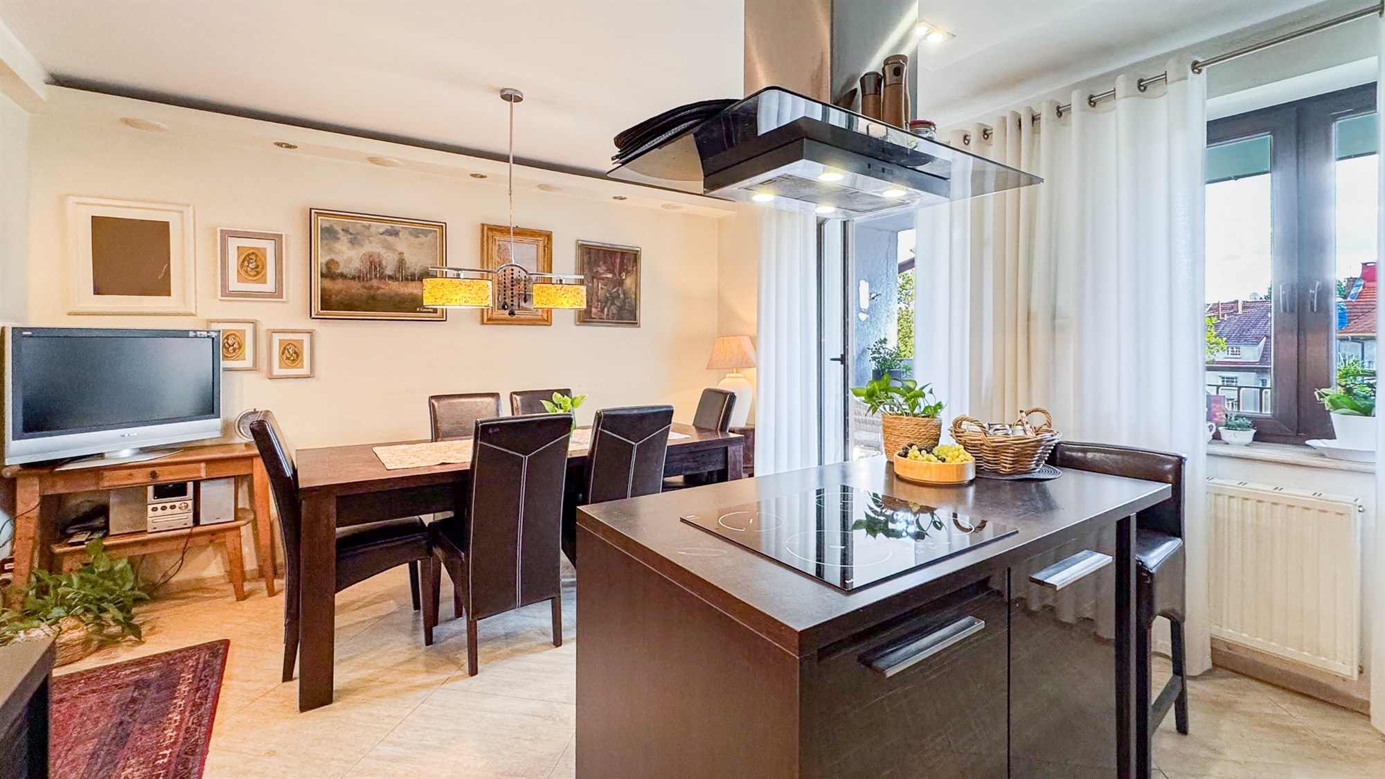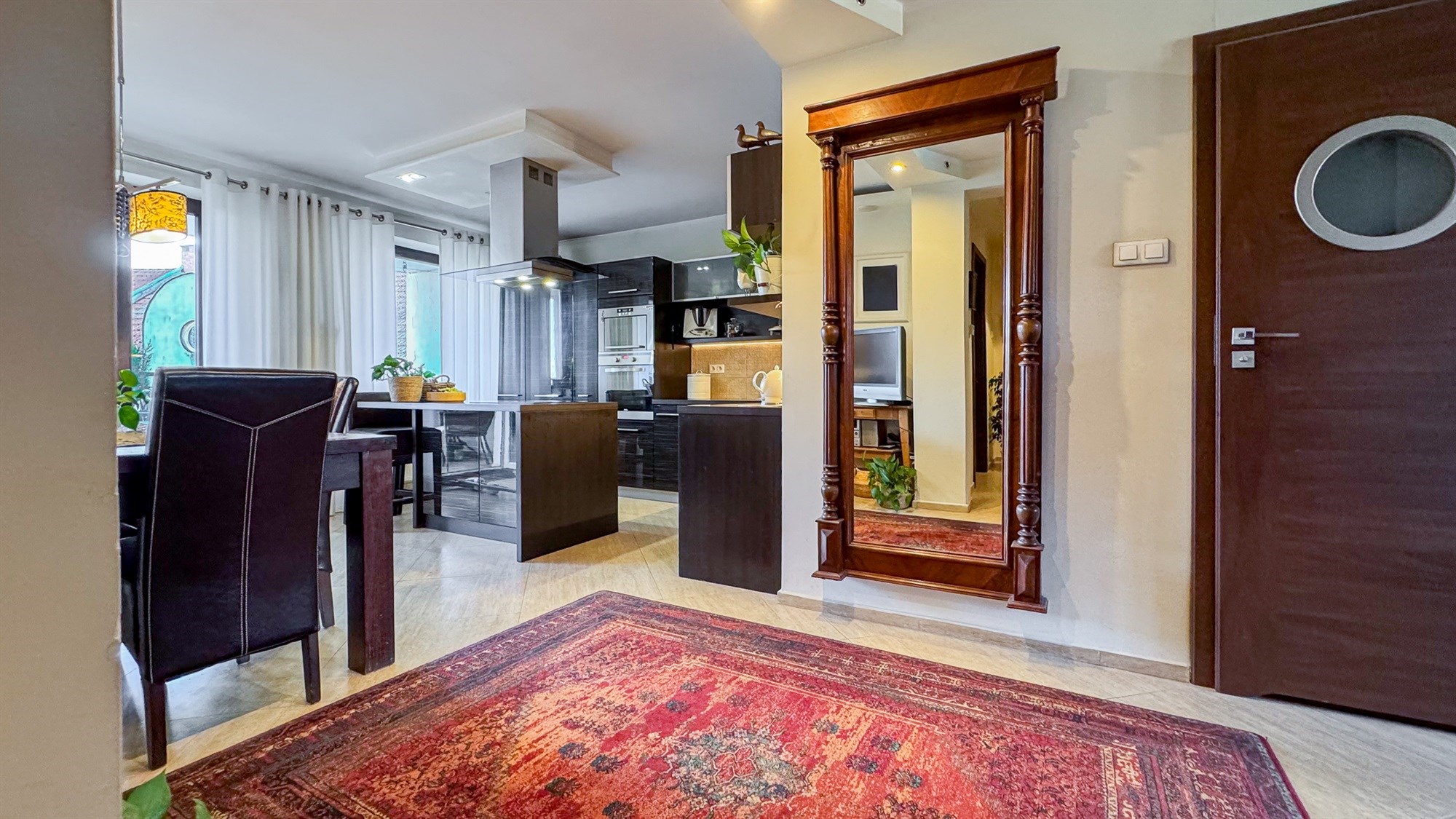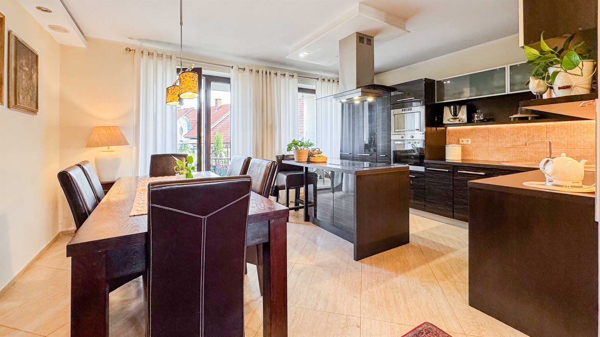 Kuchnia z aneksem i jadalnią – 19,70 m² To serce mieszkania — duża, jasna przestrzeń, która łączy funkcję gotowania, spożywania posiłków i codziennych spotkań domowników. Kuchnia wyposażona jest w pełny zestaw sprzętów AGD, a jadalnia z solidnym stołem kolonialnym i skórzanymi krzesłami tworzy elegancką, reprezentacyjną część wnętrza. Z kuchni prowadzi wyjście na przestronny balkon.