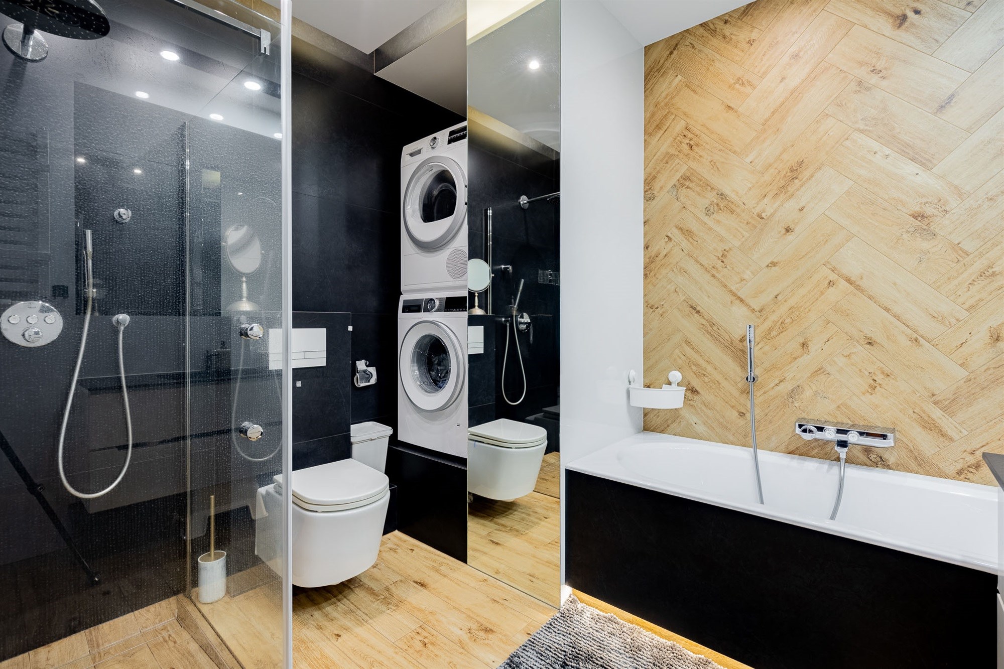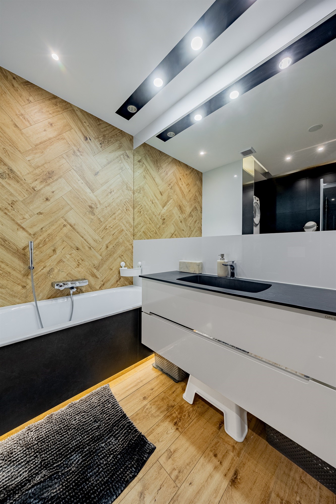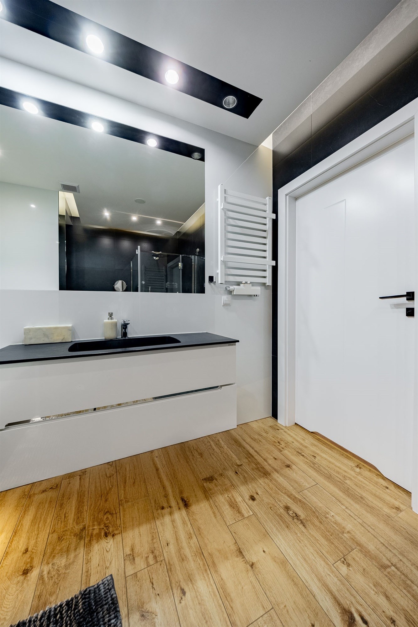 - Łazienka zachwyca przestrzenią — znajduje się tu komfortowa kabina prysznicowa, wanna, miejsce na pralkę i suszarkę, a także nowoczesne oświetlenie podkreślające elegancki charakter wnętrza.
