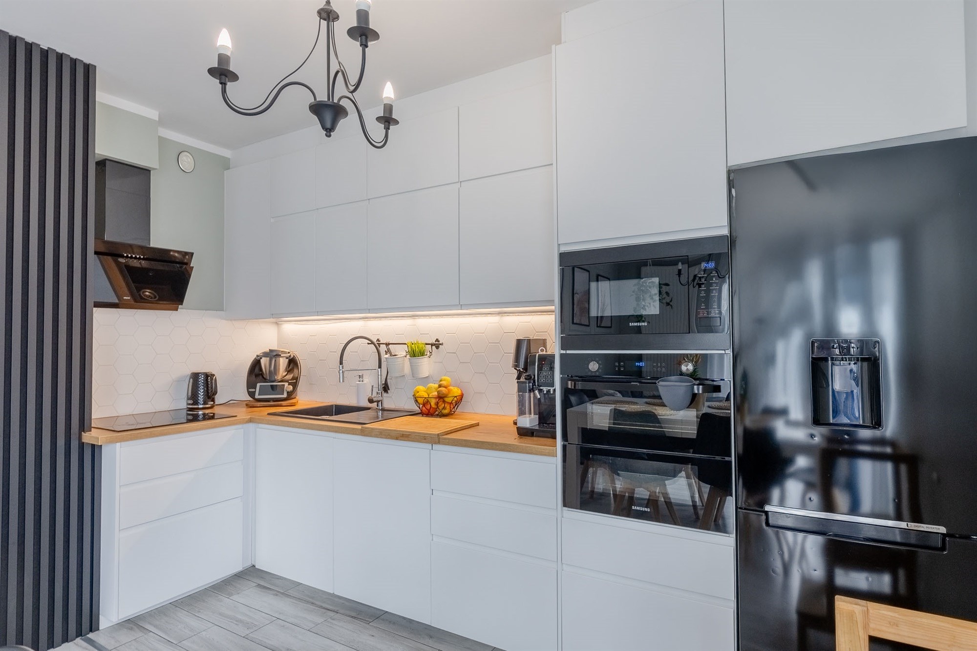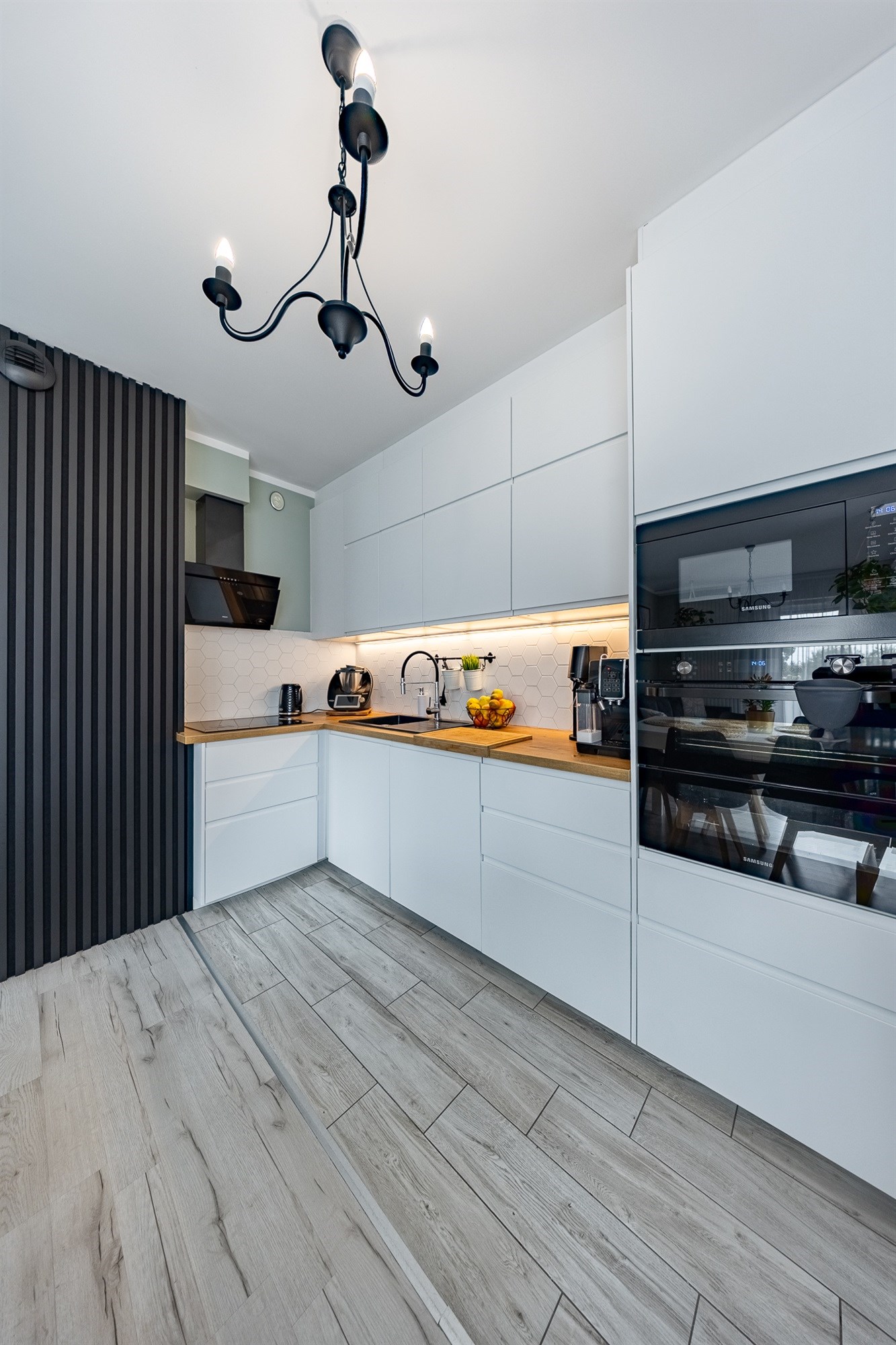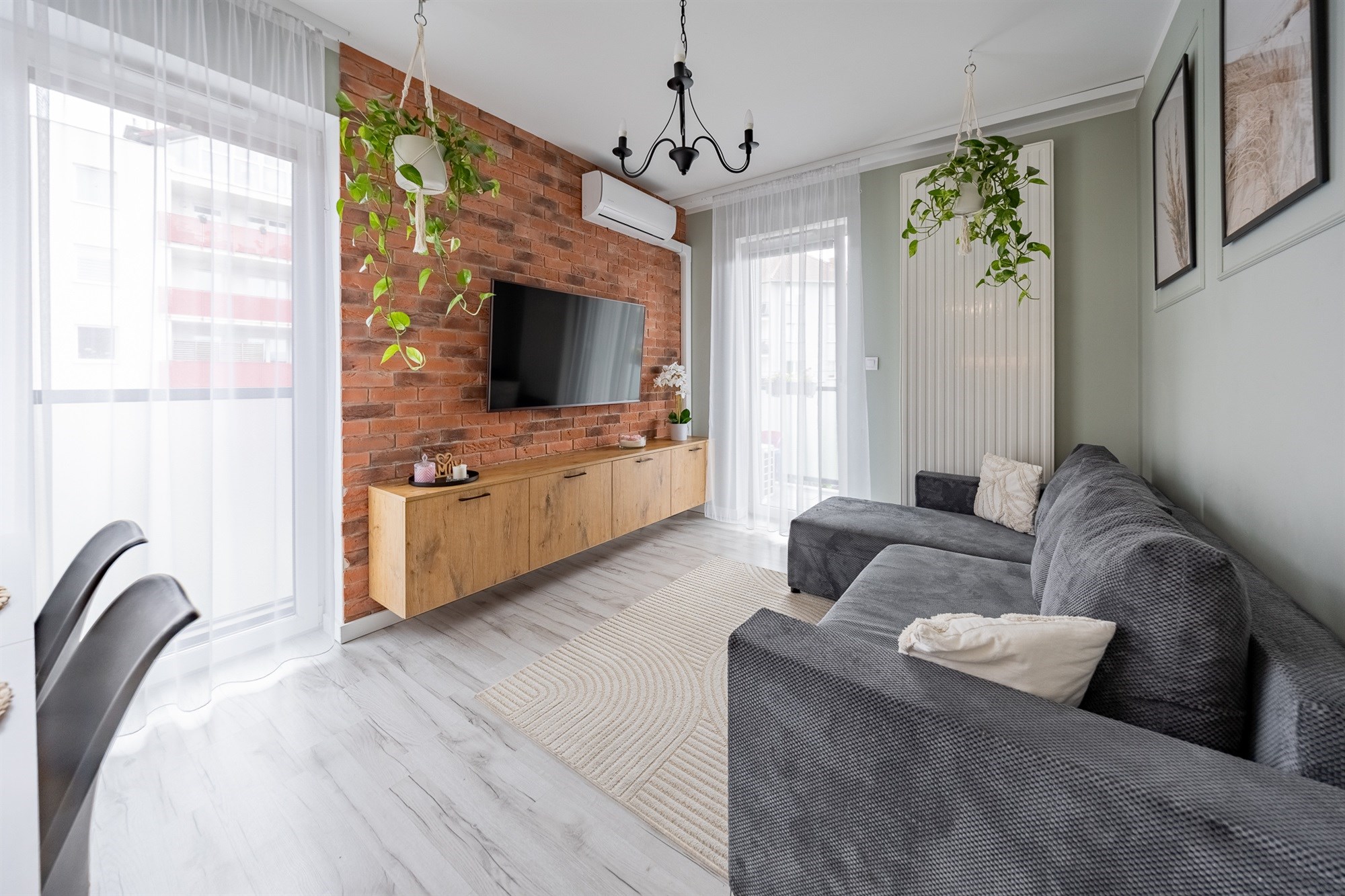 - Przestronny Salon z Aneksem Kuchennym (pow. 21,8m2): Serce domu to funkcjonalny salon z otwartym aneksem, wyposażonym w nowoczesną zabudowę kuchenną i wysokiej klasy sprzęt AGD. Elementy takie jak designerska sztukateria na ścianach oraz dekoracyjna cegła nadają wnętrzu niepowtarzalny charakter, łącząc eklektyczny styl z domowym ciepłem. W salonie zainstalowano klimatyzację, gwarantując komfort w upalne dni.