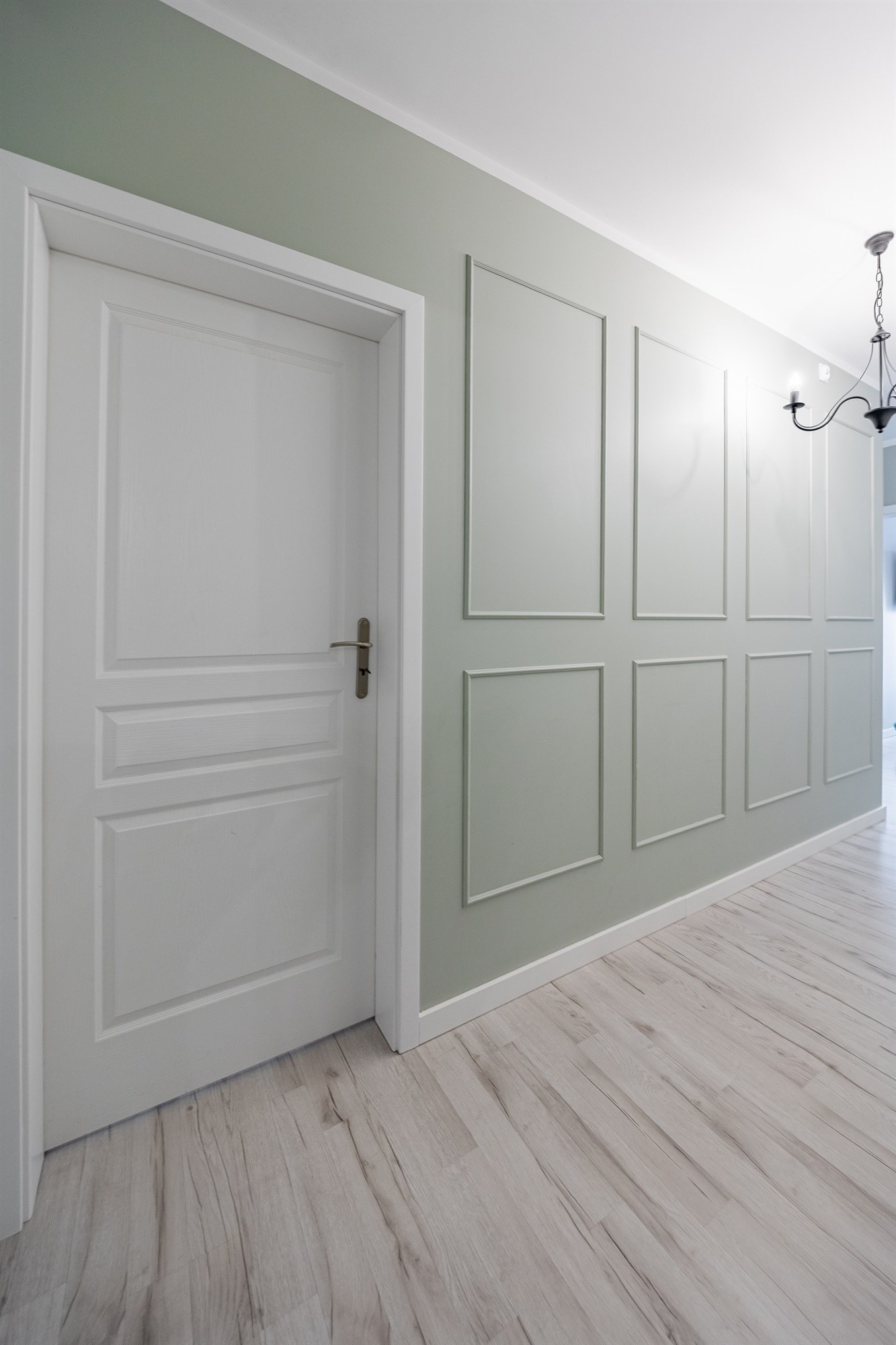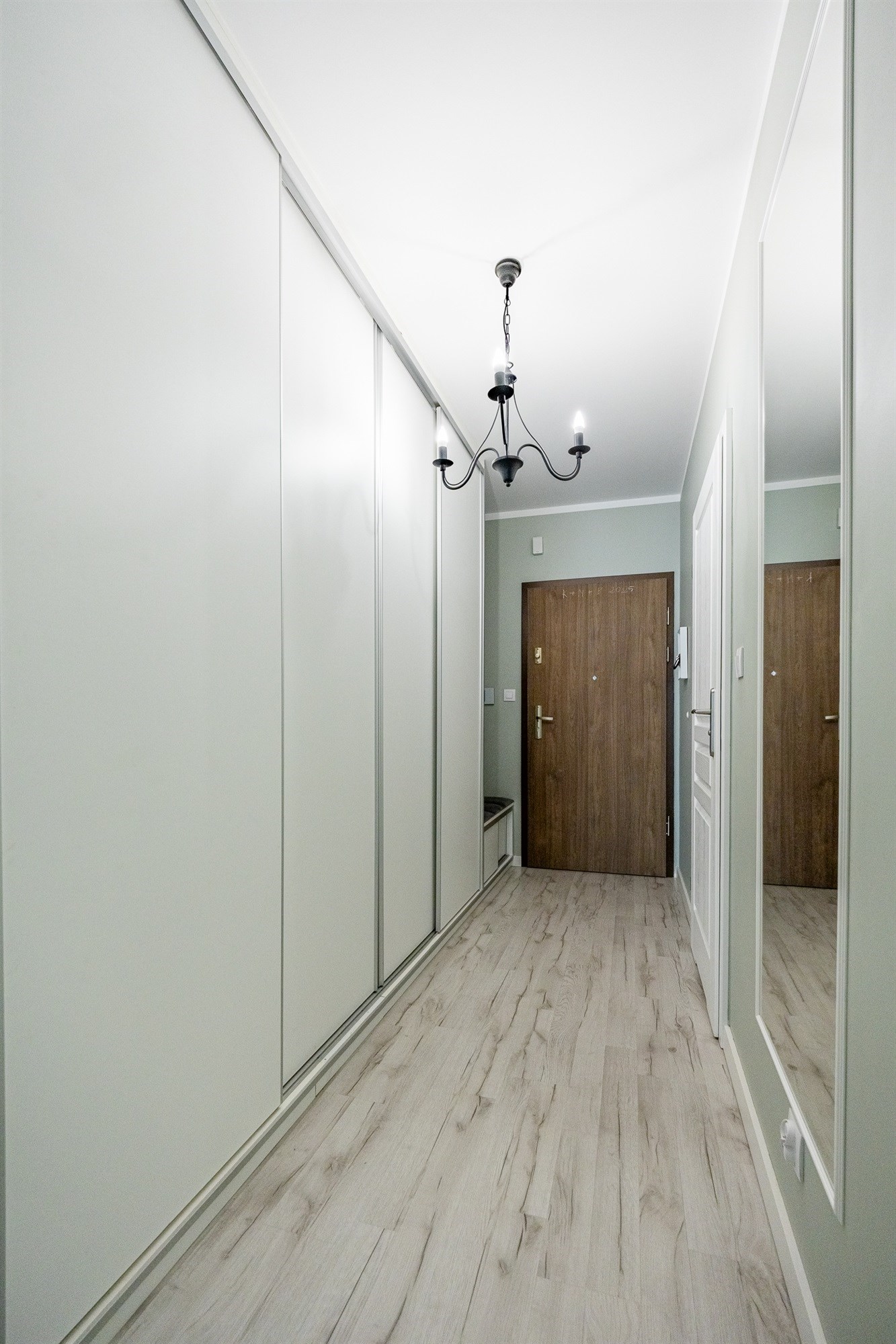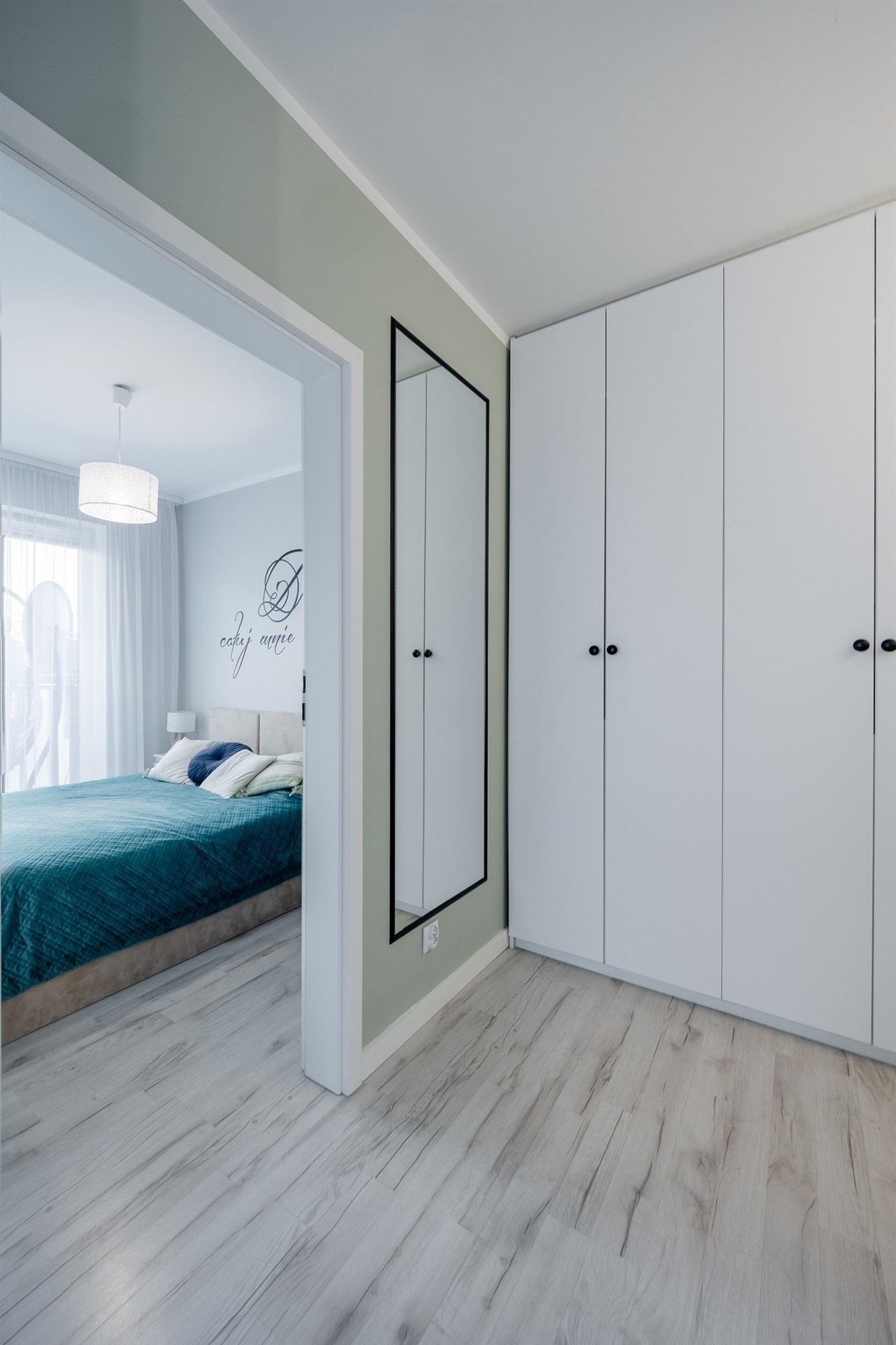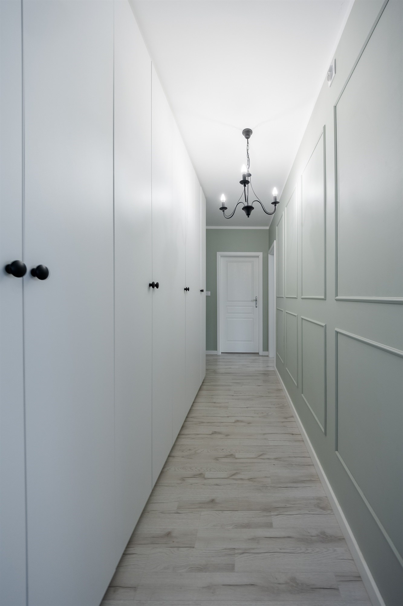 - Świetnie Wykorzystana Przestrzeń: Cała powierzchnia korytarza została efektywnie wykorzystana pod zabudowę w pojemne szafy. To świetnie rozwiązana przestrzeń do przechowywania, dzięki której nie ma konieczności stawiania szaf w pokojach, co pozwala na maksymalne wykorzystanie ich przestrzeni i swobodę aranżacji.