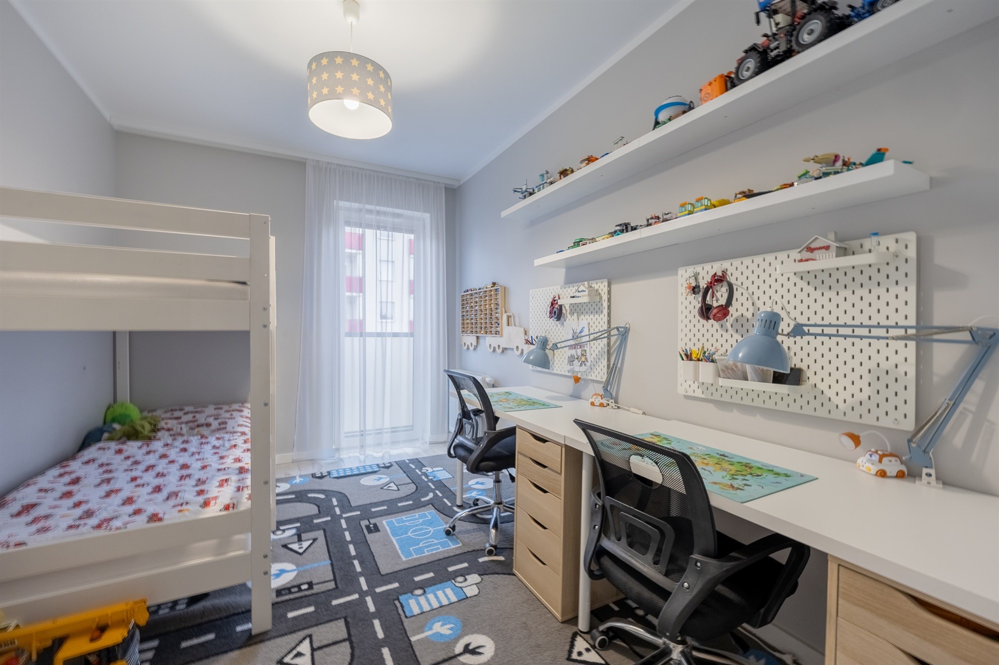 - Trzy Prywatne Sypialnie (pow. 10 m2, 10 m2, 8 m2): Mieszkanie oferuje trzy niezależne sypialnie, zapewniając każdemu członkowi rodziny własną, komfortową przestrzeń. W jednej z sypialni znajdziesz wygodne łóżko i bezpośrednie wyjście na duży balkon.