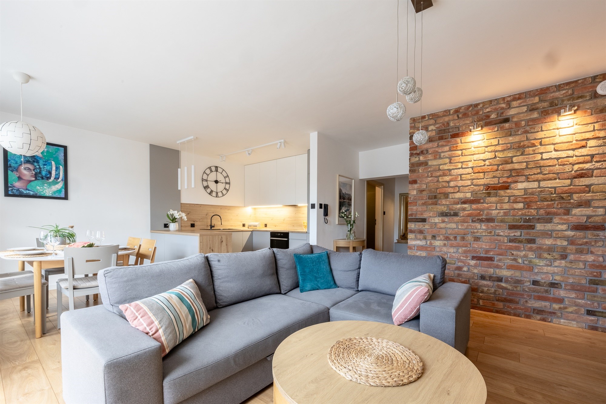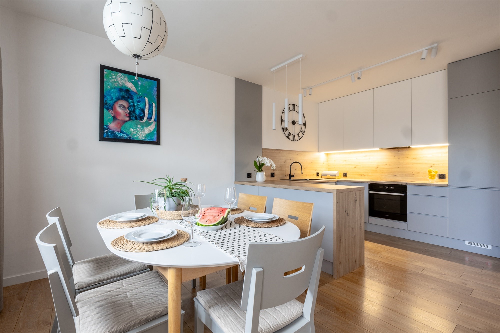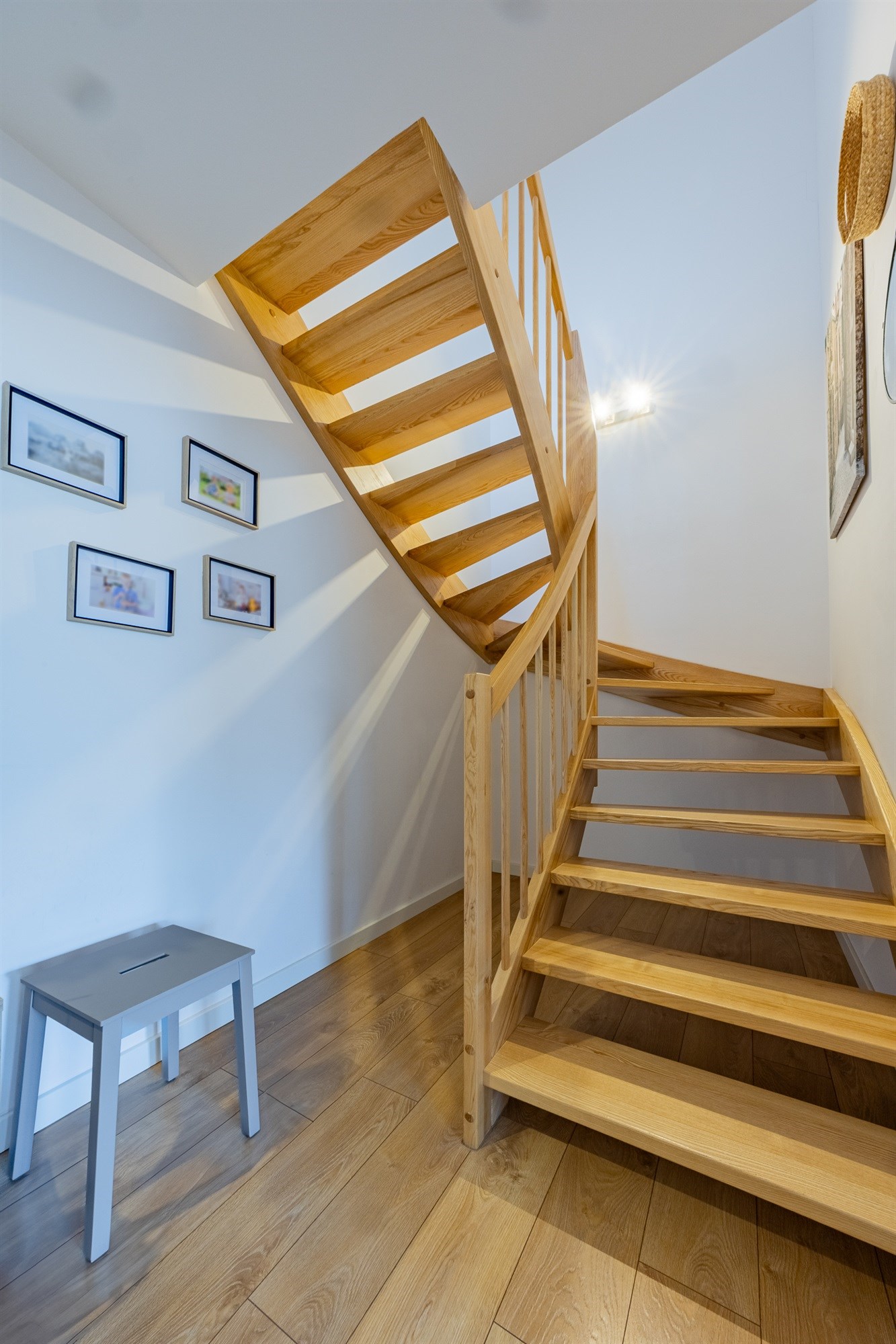 Mieszkanie utrzymane w bardzo wysokim standardzie – świeża zabudowa kuchenna wraz z pełnym wyposażeniem AGD, eleganckie schody jesionowe prowadzące na piętro, starannie dobrane materiały wykończeniowe.