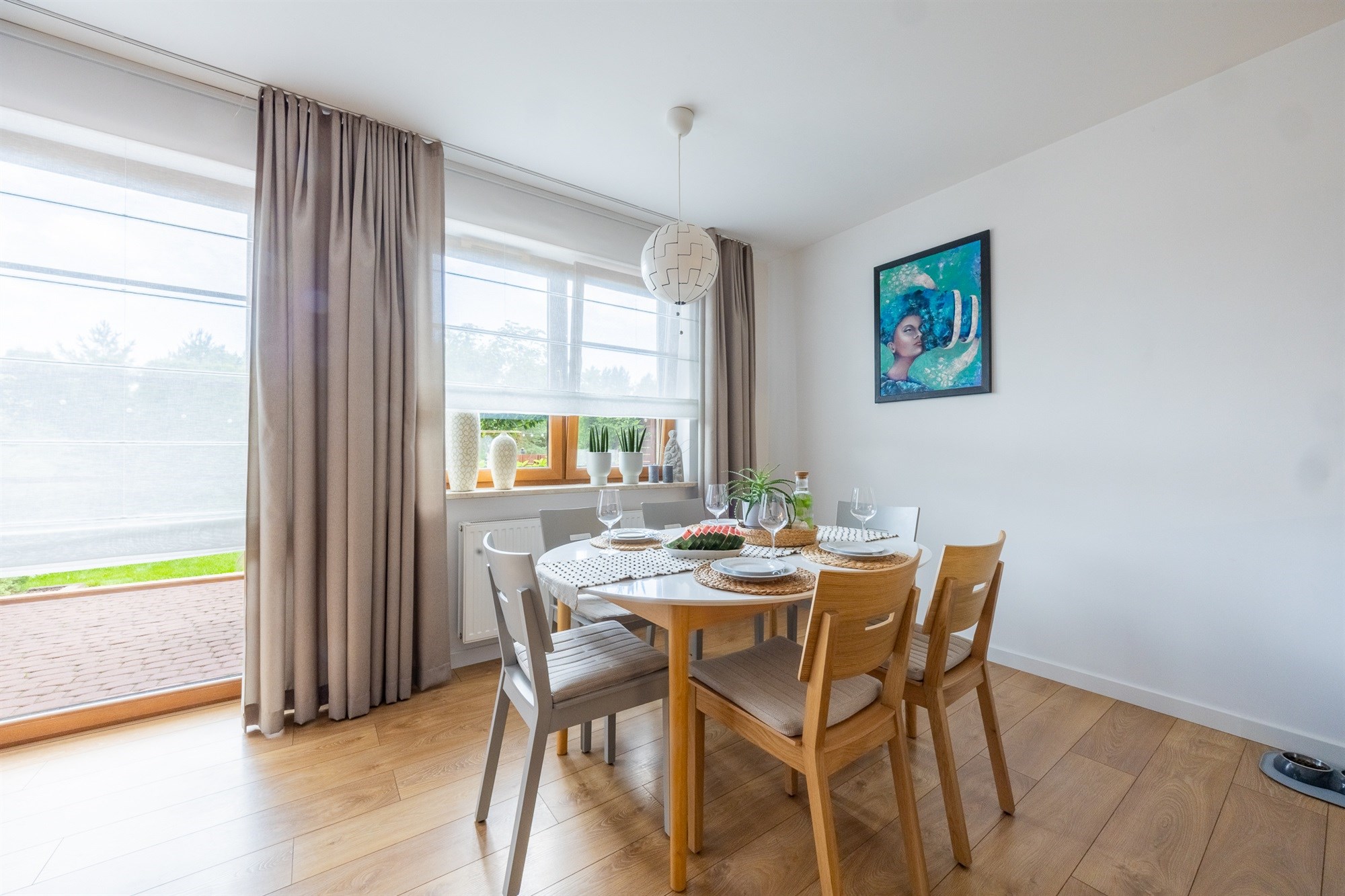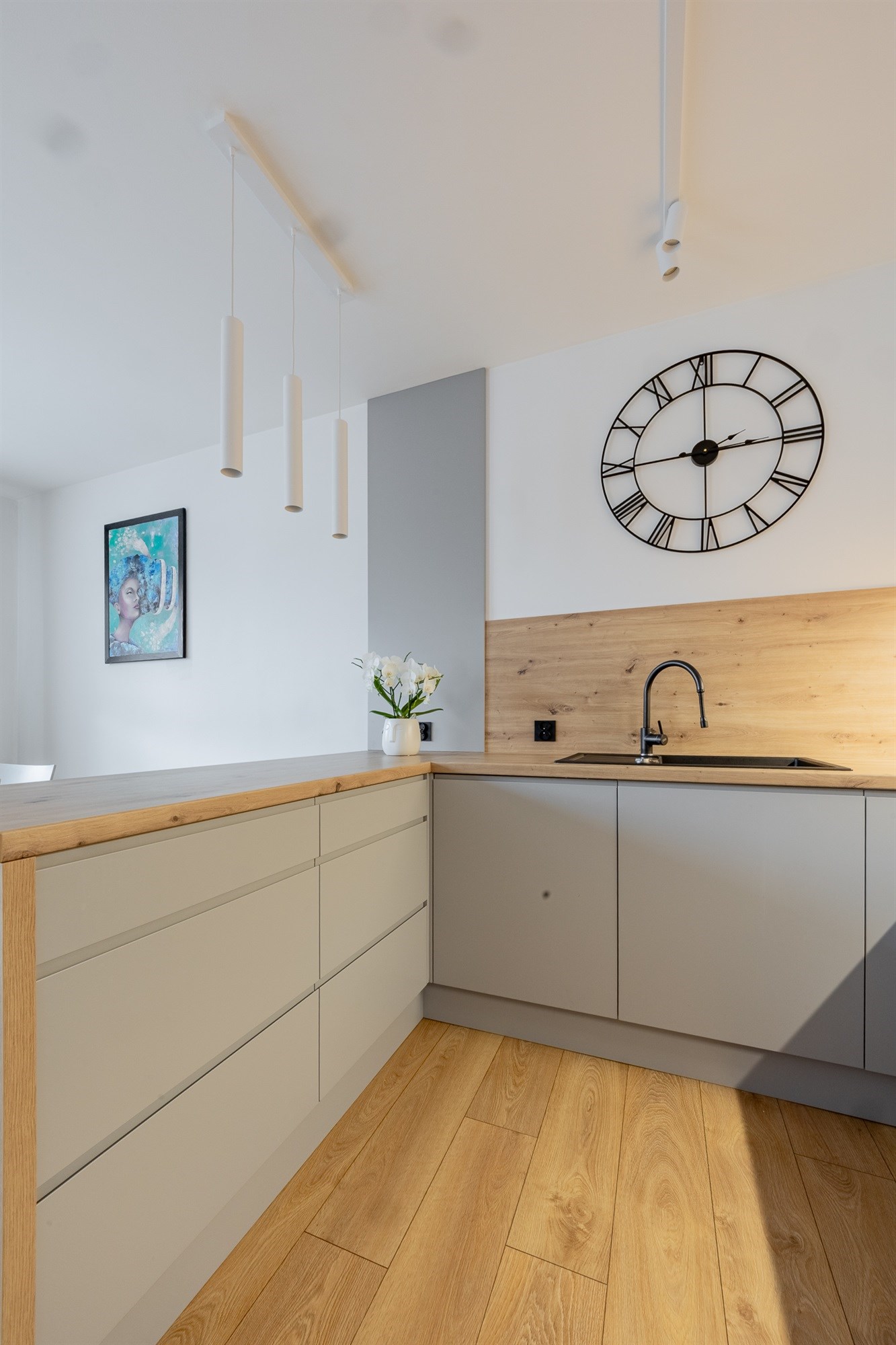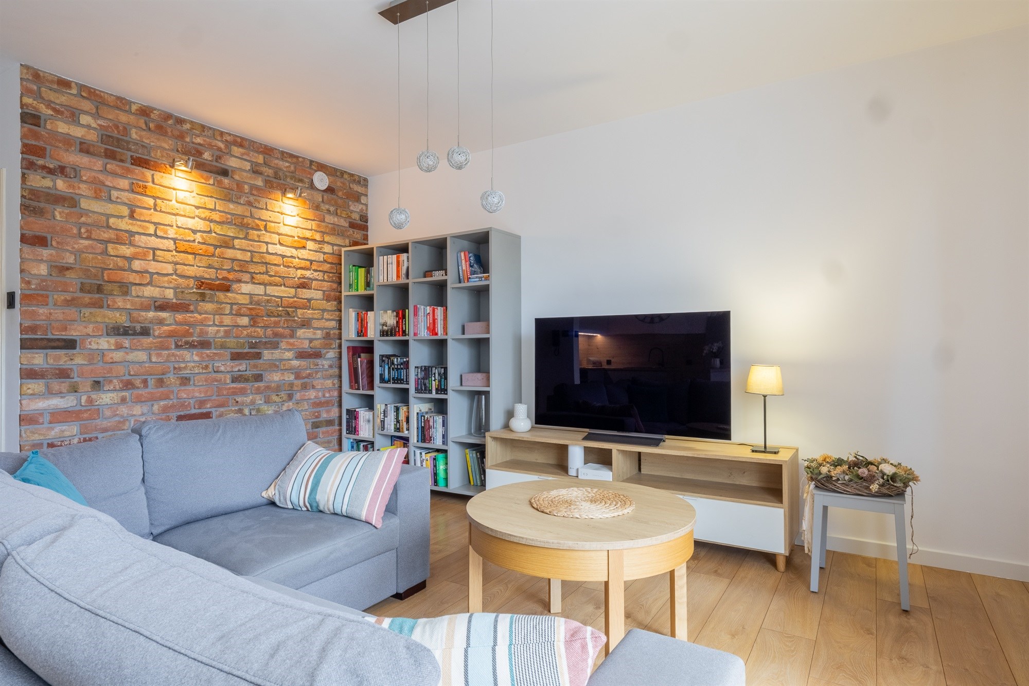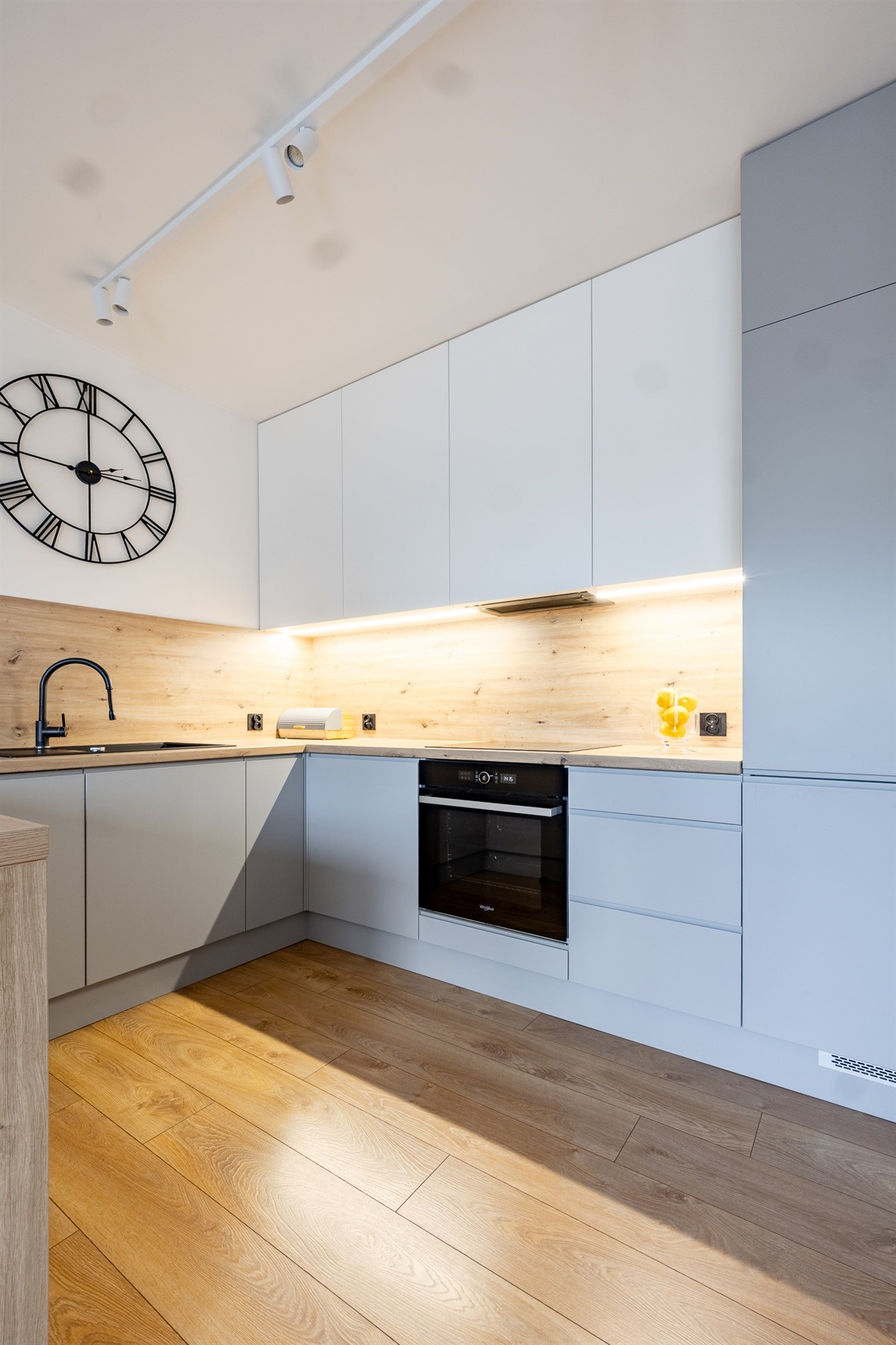 Mieszkanie utrzymane w bardzo wysokim standardzie – świeża zabudowa kuchenna wraz z pełnym wyposażeniem AGD, eleganckie schody jesionowe prowadzące na piętro, starannie dobrane materiały wykończeniowe.