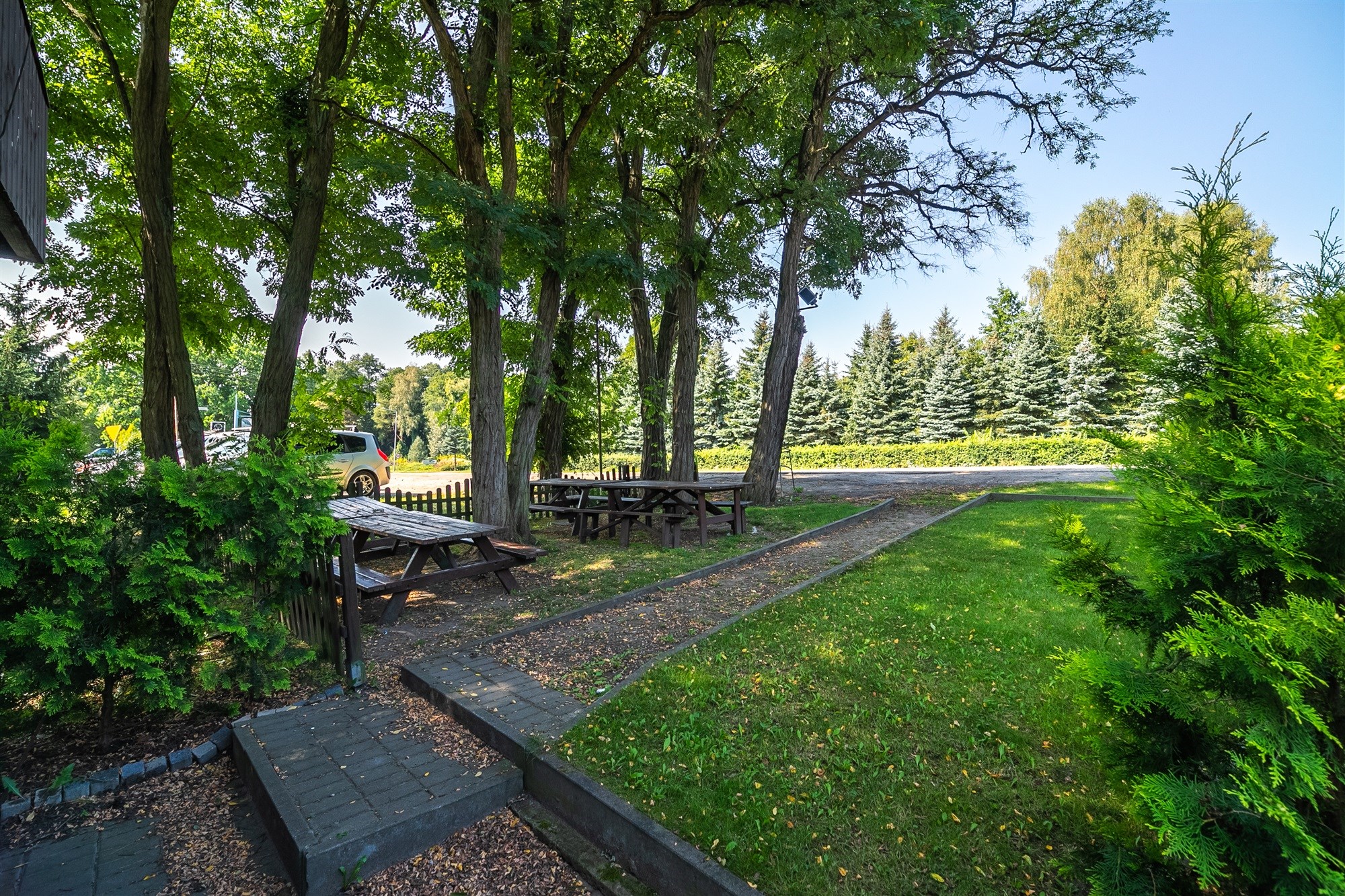 - ogródek z 9 drewnianymi stołami wraz z ławami